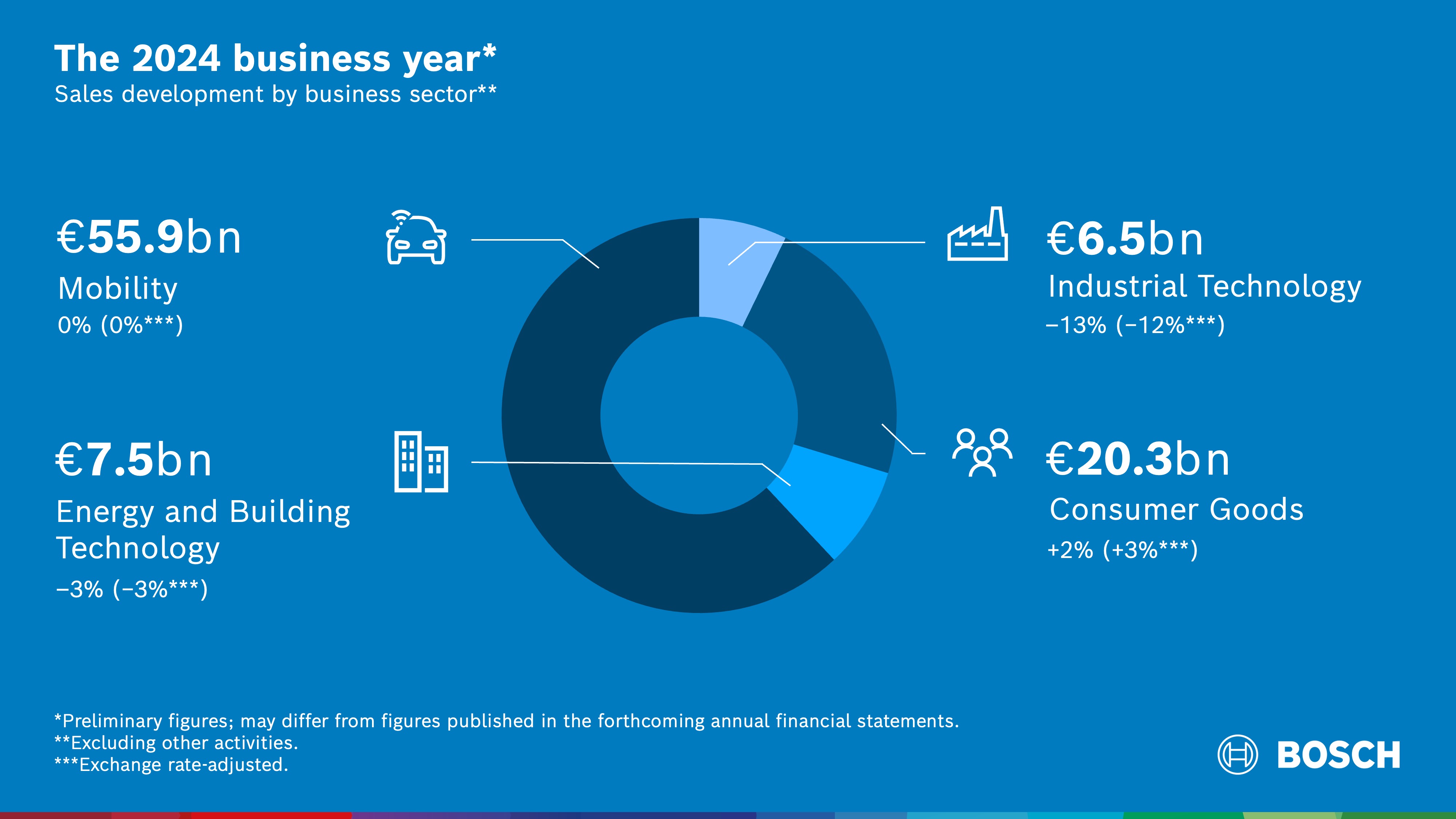 Trods et globalt økonomisk klima med svag vækst lykkedes det Bosch at fastholde sin position i markedet: “Selvom vi i Bosch ikke har været fuldstændig immune over for de økonomiske udviklinger i 2024, så har vi klaret os respektabelt i 2024 sammenlignet med vores konkurrenter,” sagde Stefan Hartung, formand for Boschs bestyrelse, med henvisning til virksomhedens foreløbige forretningsresultater. Han henviser til, at Boschs teknologier til mobilitet og fremtidens hjem fortsat vil være afgørende vækstområder.