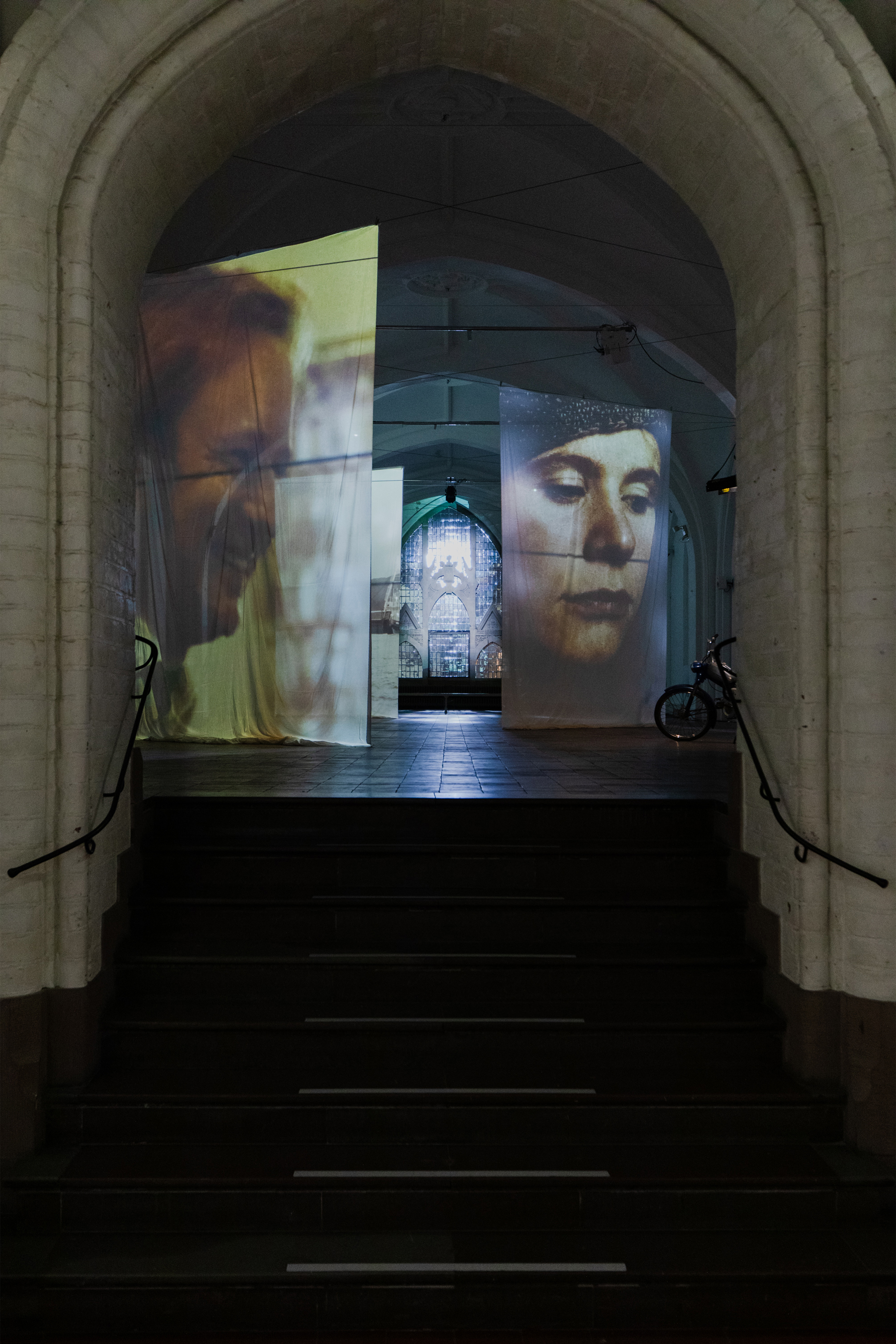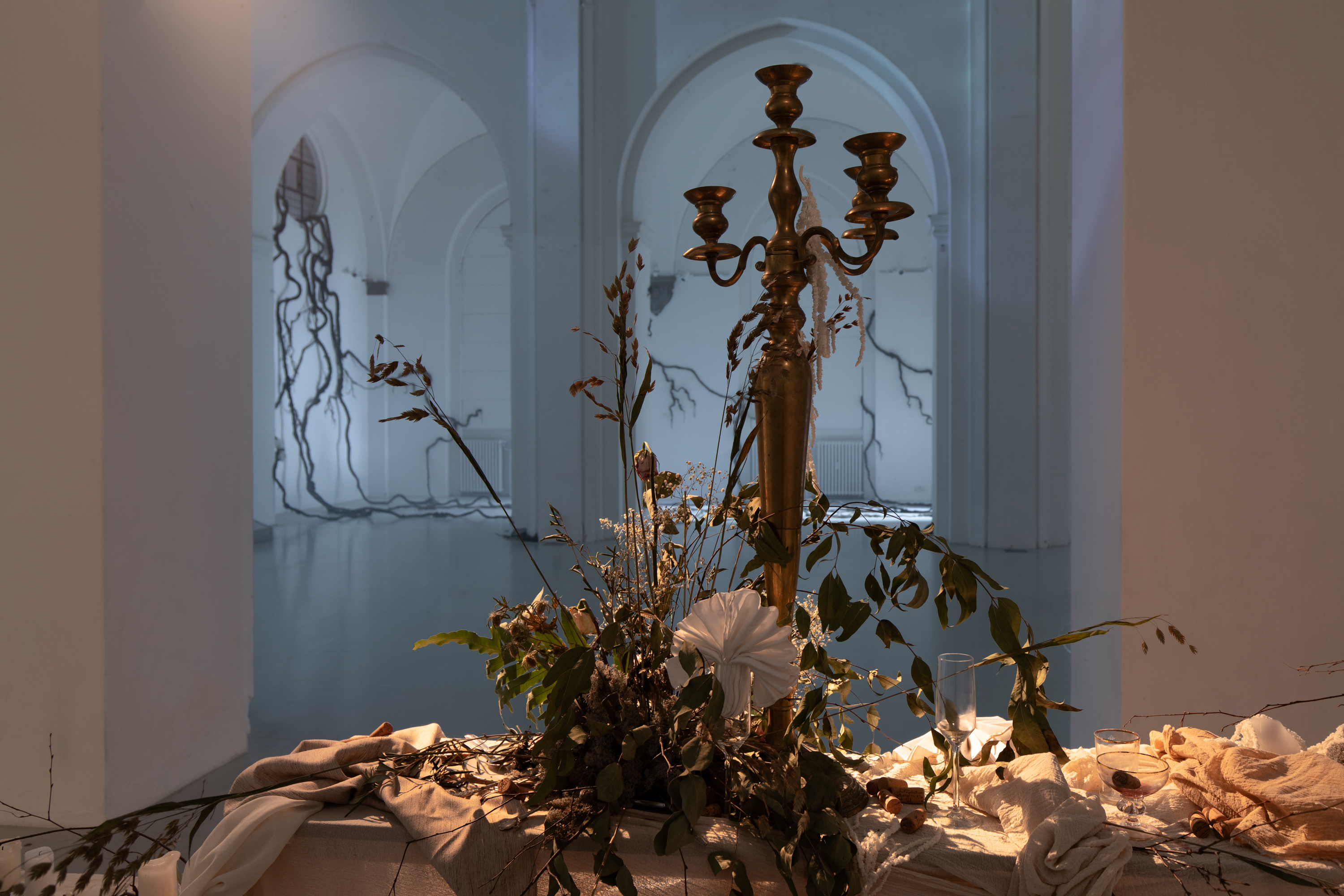 Solitude Studios bidrag til udstillingen Breaking Darkness tæller bl.a. moslignede lianer, der snor sig op af søjler og gulv (Melancholia, Nedre Galleri) og store tekstiler, der – gennemprojekteret af flimrende filmloops – hænger bølgende ned fra loftet og mimer karakteren Bess’ historie (Breaking the Waves, Øvre Galleri).