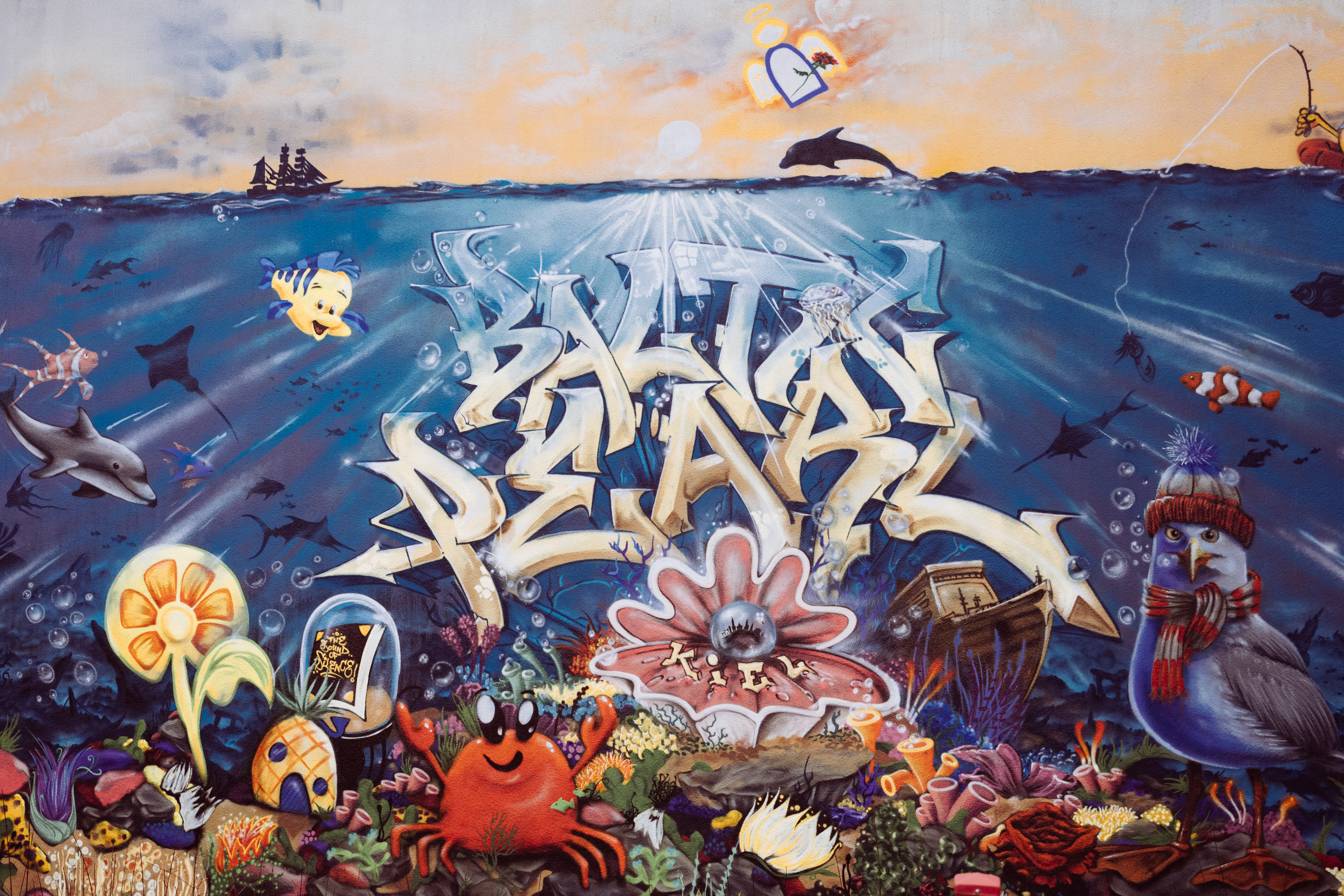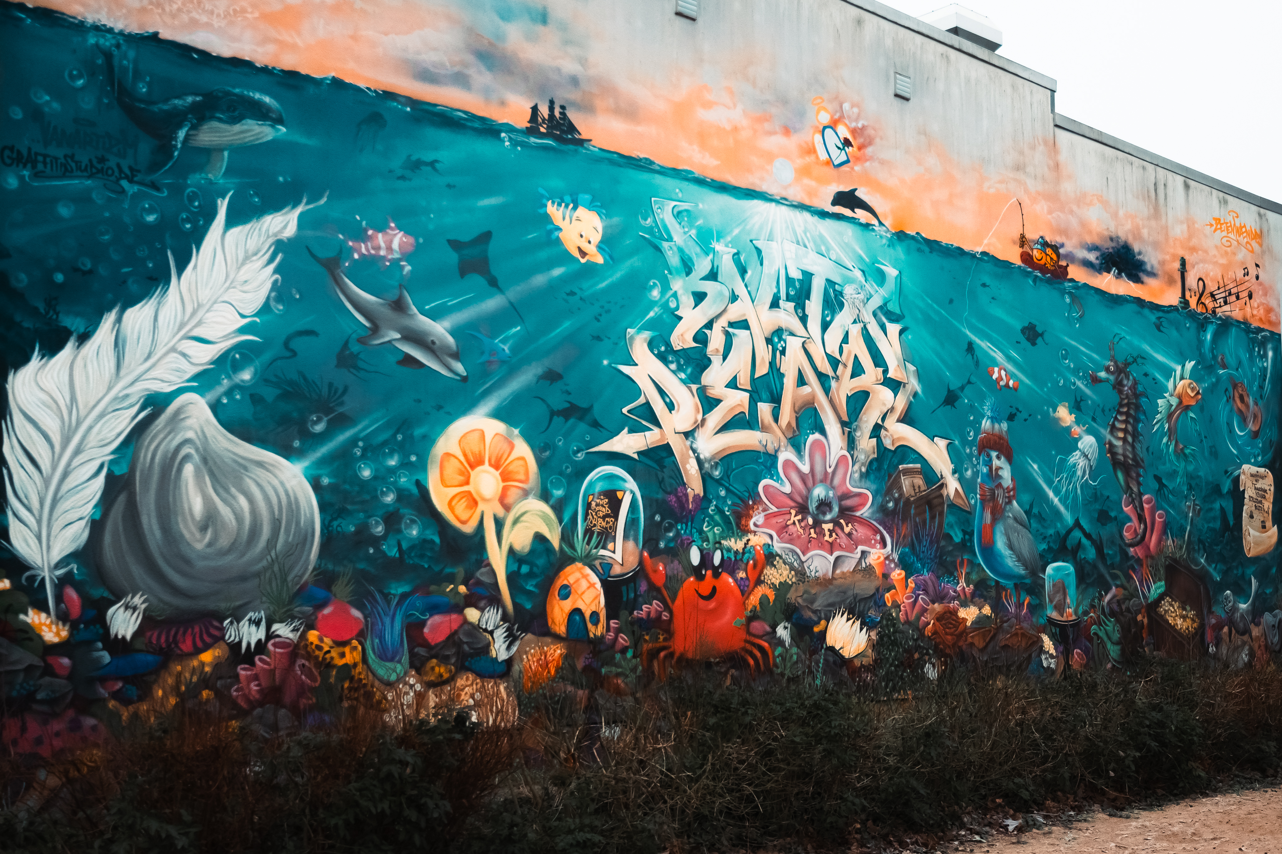 A visit to Kiel shows just how successful this can be. On a cloudy, rainy day, the huge graffiti on the wall of a playground acts like a battery charger for the eyes and the soul. Almost 100 square metres in size, the combination of various maritime motifs results in a picture that features scenes from the Pirates of the Caribbean movie franchise as well as comic-like depictions of animals that inhabit the nearby Baltic. The graffiti, on the Lerchenstraße playground, is a joint project by well-known local street artists and the Trauernde Kinder Schleswig-Holstein association.
