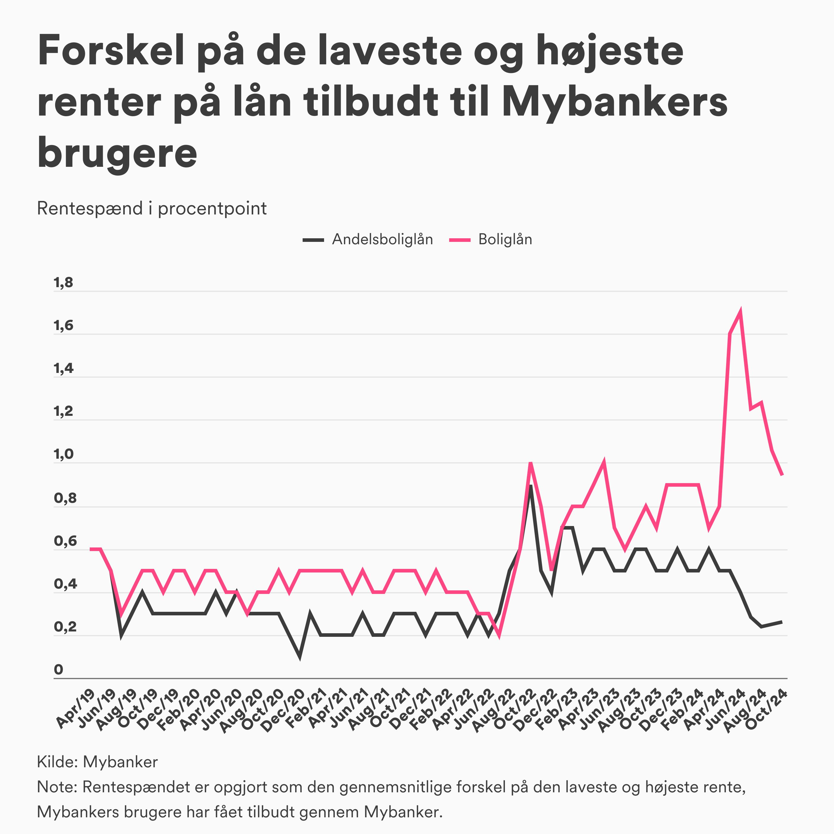 Den gennemsnitlige rente dækker over mærkbare forskelle på de højeste og laveste renter på lån, som Mybankers brugere er blevet tilbudt af bankerne. I januar lød den gennemsnitlige forskel på 0,8 procentpoint for boliglån og 0,3 procentpoint for andelsboliglån.
