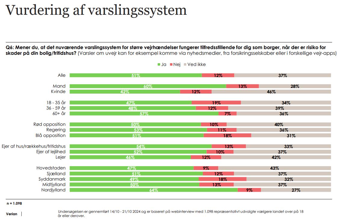 Undersøgelsen, der er lavet af analyseinstituttet Verian for If Forsikring, viser, at halvdelen af danskerne har tillid til, at myndighederne vil varsle dem om større vejrhændelser, der kan medføre skader på deres bolig. Men mere end hver tredje, 37 procent, kan ikke svare på, om de har tillid til, at varslingssystemet i Danmark fungerer tilstrækkeligt, og 12 procent melder klart nej til tilliden.