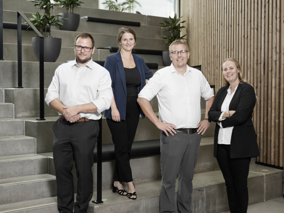 Advodan Vejle (fra venstre: advokatfulmægtig Kristian Bruun Jensen, advokat Vibe Hjort Vieland Nielsen, advokat Christopher Bühl Nielsen og advokat Laura Ferslev Topsøe-Jensen)