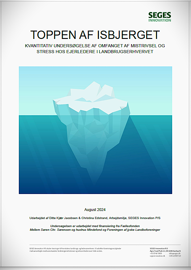 Den danske landmand går glad og tilfreds til dagens arbejde, uanset om han har svin, køer eller dyrker afgrøder. Familien er vigtig for ham, mentale problemer er ikke det store samtaleemne, og stressniveauet er nok ikke værre end i andre job. Det er nogle af konklusionerne fra en ny undersøgelse, "Toppen af isbjerget", lavet af SEGES INNOVATION P/S, der blev færdig i august 2024.