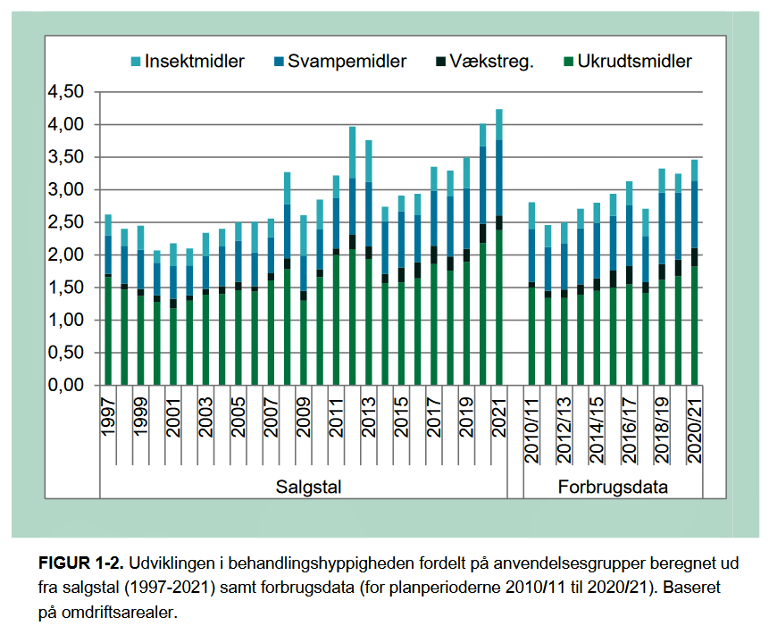 Forureningen med sprøjtegifte i Danmark har et meget stort omfang, fordi landet er så hårdt dyrket, og fordi brugen af sprøjtegifte er steget voldsomt i de seneste år. Omkring halvdelen af nationens areal giftsprøjtes nu i gennemsnit 5,37 gange årligt (2022), hvilket i realiteten medfører, at der konstant er sprøjtegifte i jorden, i luften og i vandet.