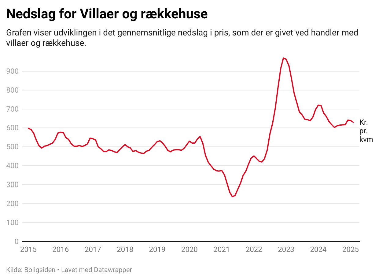 I februar 2025 lå det gennemsnitlige nedslag for huse på 630 kroner pr. kvadratmeter, svarende til en rabat på 94.500 kroner for et hus på 150 kvadratmeter. Det viser nye tal fra Boligsidens Markedsindeks.