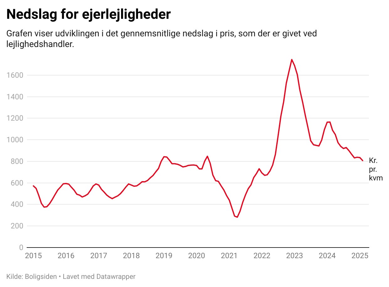 Nedslagene faldt også for ejerlejligheder i februar. Den gennemsnitlige rabat på en ejerlejlighed endte på 807 kroner pr. kvadratmeter efter et fald på 3,4 procent fra måneden før. Nedslaget er nu på niveau med det, vi så i perioden lige før corona.