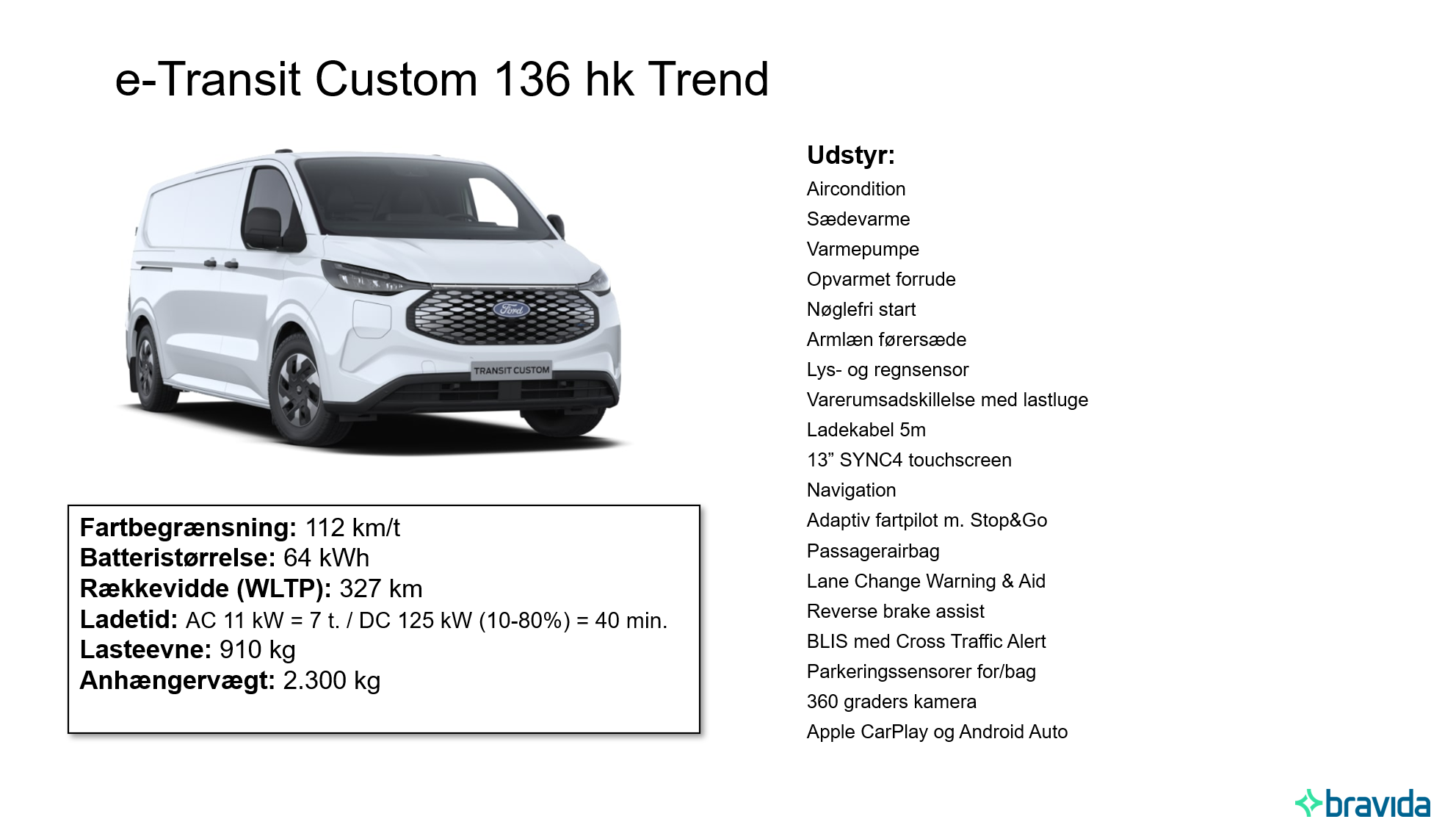 ”Jeg glæder mig over, at vi kan annoncere bestillingen af hele 300 nye elektriske varebiler. I Bravida ønsker vi at accelerere omstillingen til elektriske biler i vores flåde, hvilket denne nye aftale bestyrker. Jeg forventer, at vi fortsætter transitionen til elbiler i høj fart fremadrettet. Vores forretning er i høj grad bygget på mobilitet, hvorfor jeg glæder mig over, at endnu flere af vores teknikere fremadrettet vil køre rundt i splinternye el-varebiler fra Ford. De nye biler scorer højest på alle vores vigtigste parametre og leveres med topudstyret sikkerhedspakke, hvilket har været helt afgørende for os,” siger Christian Alsø, CEO i Bravida Danmark.