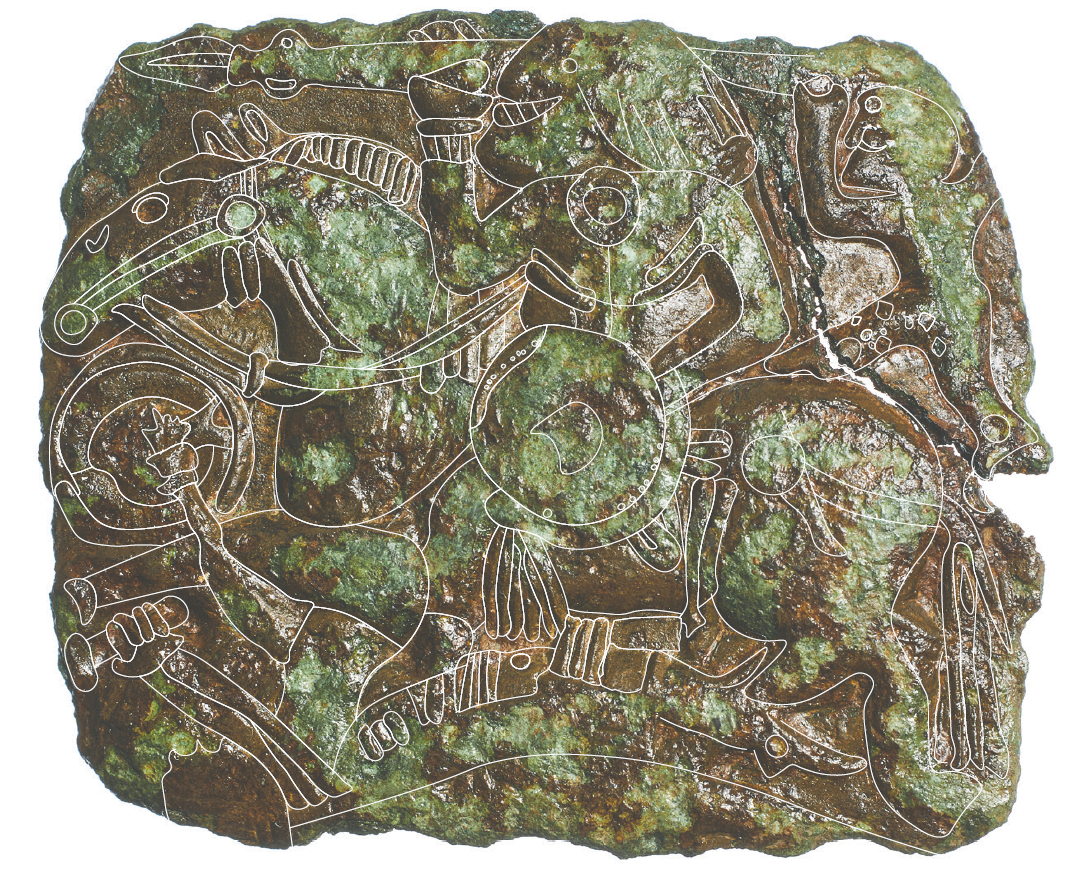 Similarities can be seen in the details, such as the cuff at the warrior’s wrist, the warrior’s hair, the almondshaped harness fitting on the horse’s head, its reins, the sword protruding below the warrior’s shield, and the ‘bunions’ or circles on the feet of the man lying down. The Swedish equivalents have a wild boar or bird of prey on the helmet, something not seen the Sutton Hoo helmet or the new find from Tåsinge.