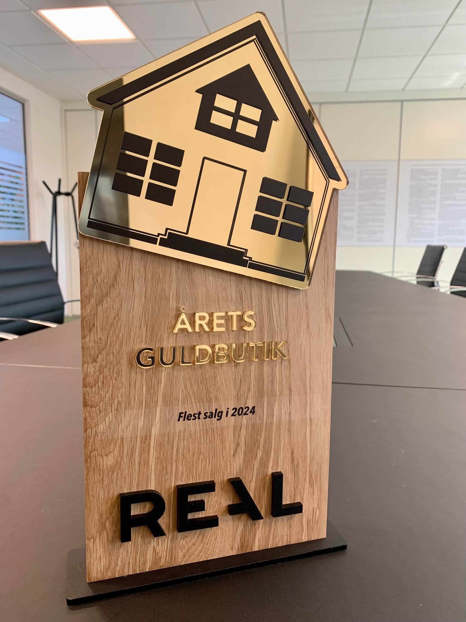 Jakob, Henrik og medarbejderne i butikken fik prisen som Årets Guldbutik overrakt af formand for bestyrelsen i RealMæglerne A/S Peter Jeppesen og næstformand Palle Kjær til store klapsalver, og kan nu samtidig se frem til et 2025, der om muligt vil kaste endnu flere bolighandler af sig.