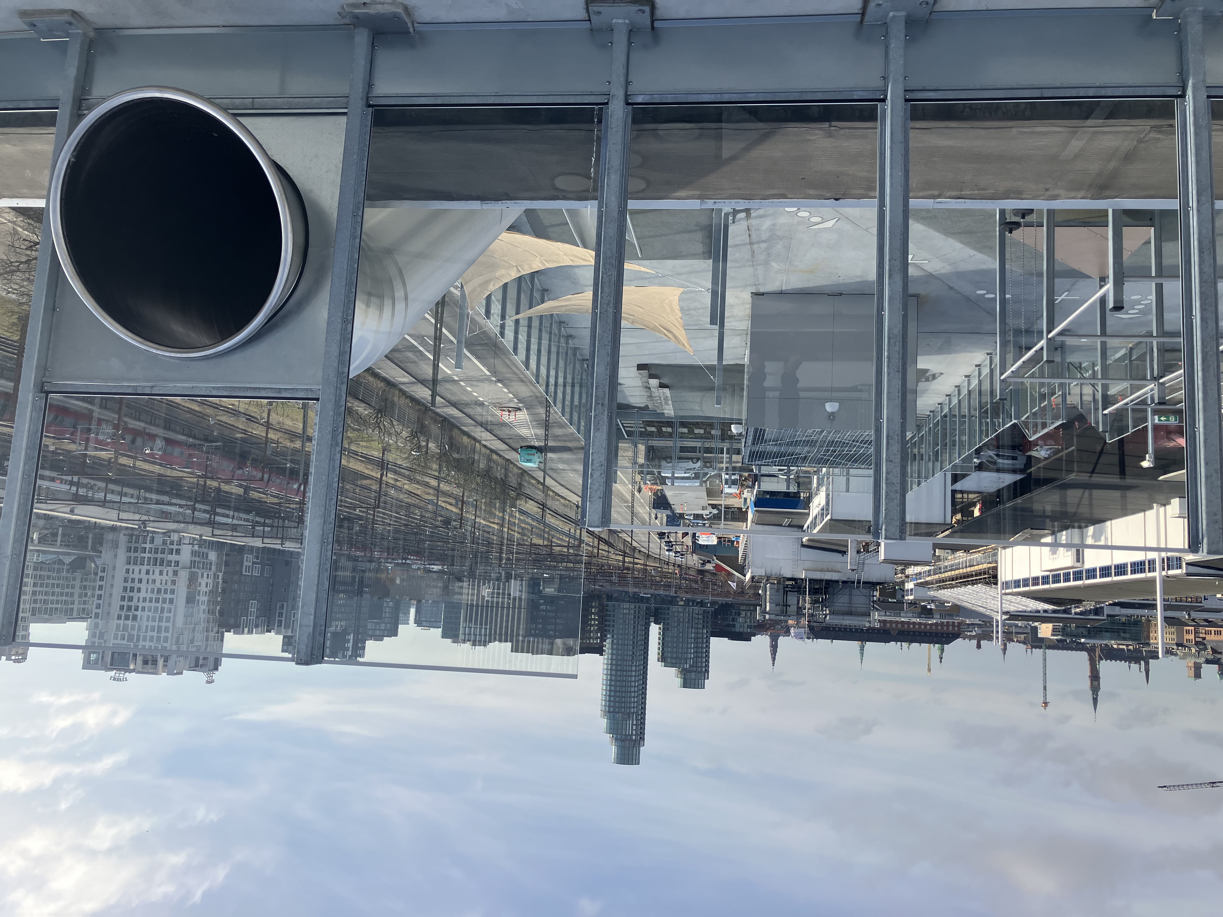 Udsigt over en by fra en bygning med glasværn, jernbanespor i midten og høje bygninger i baggrunden.