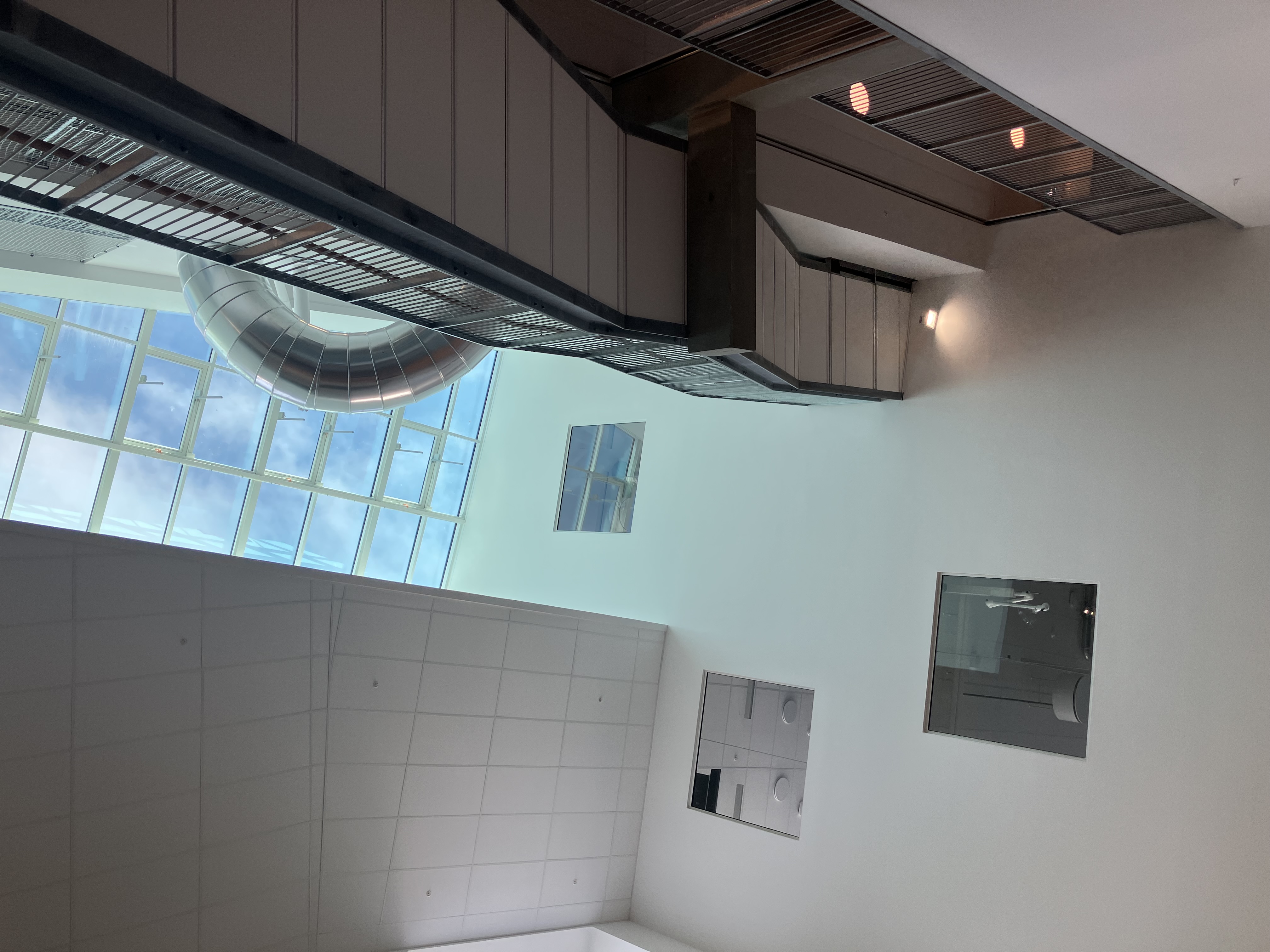 Indendørs atrium med glasloft og moderne arkitektur.