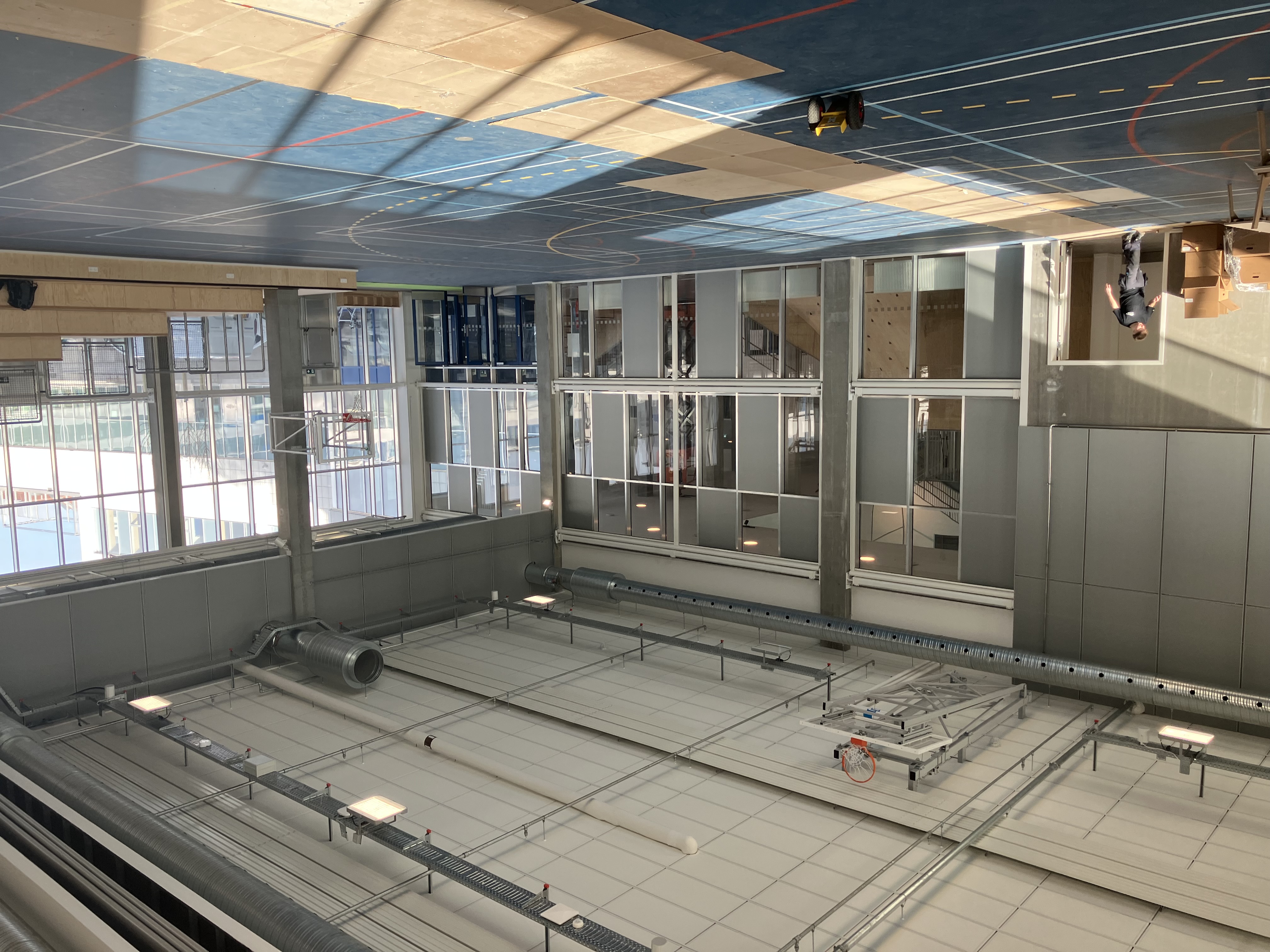 Indendørs sportshal med højt til loftet, store vinduer og tribuner langs væggen.