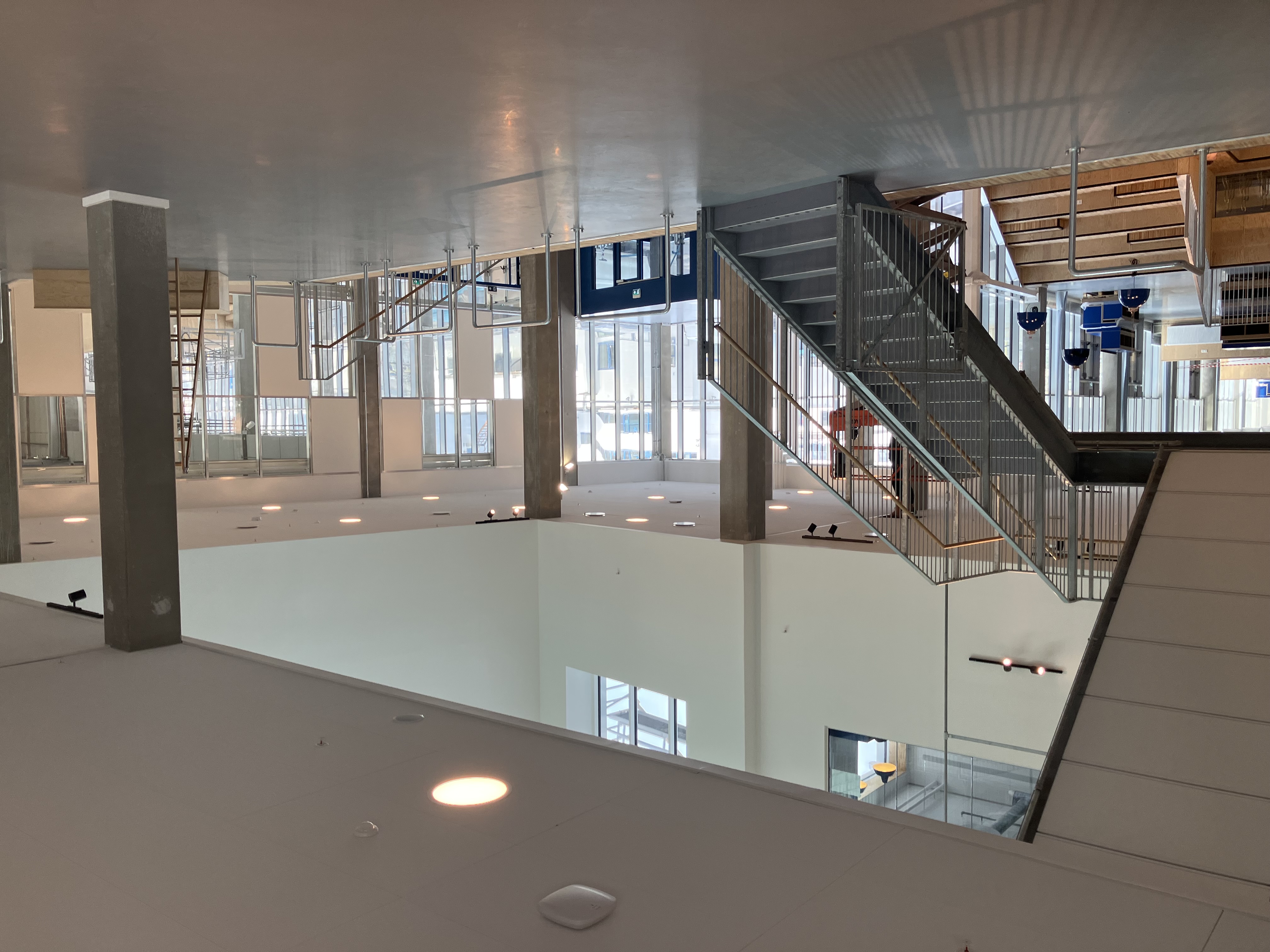 Indvendigt billede af en moderne bygning med brede trapper og store vinduer.