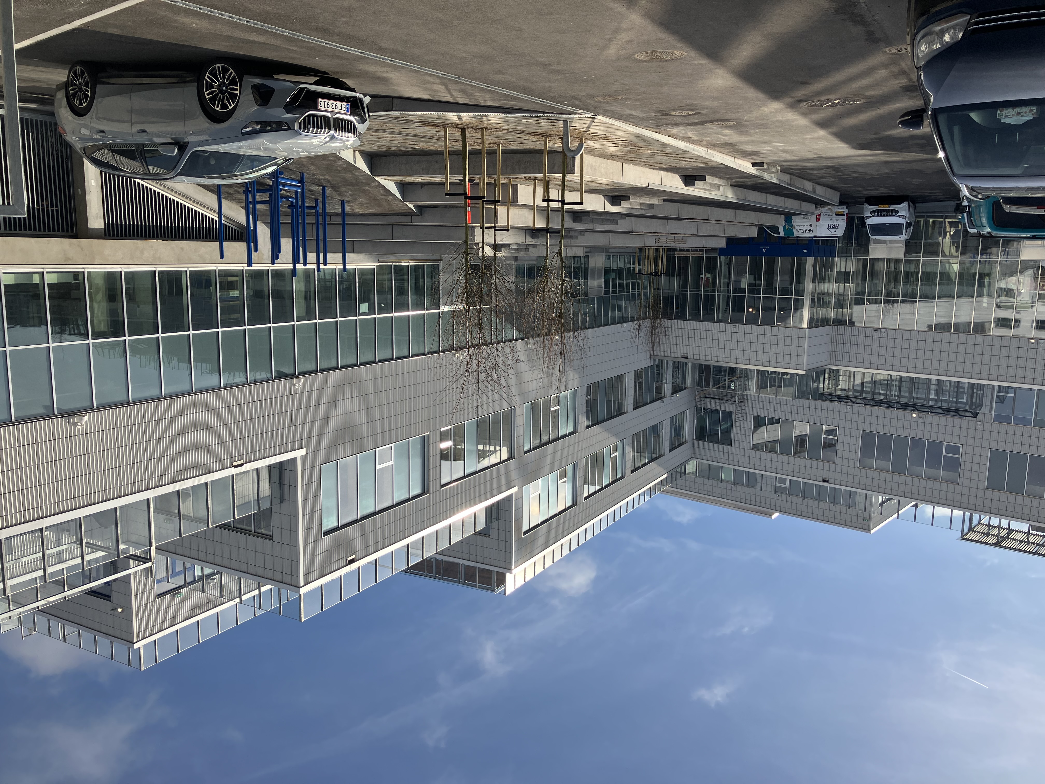 Moderne bygning med glasfacade og flere niveauer under en blå himmel. Biler parkeret foran.