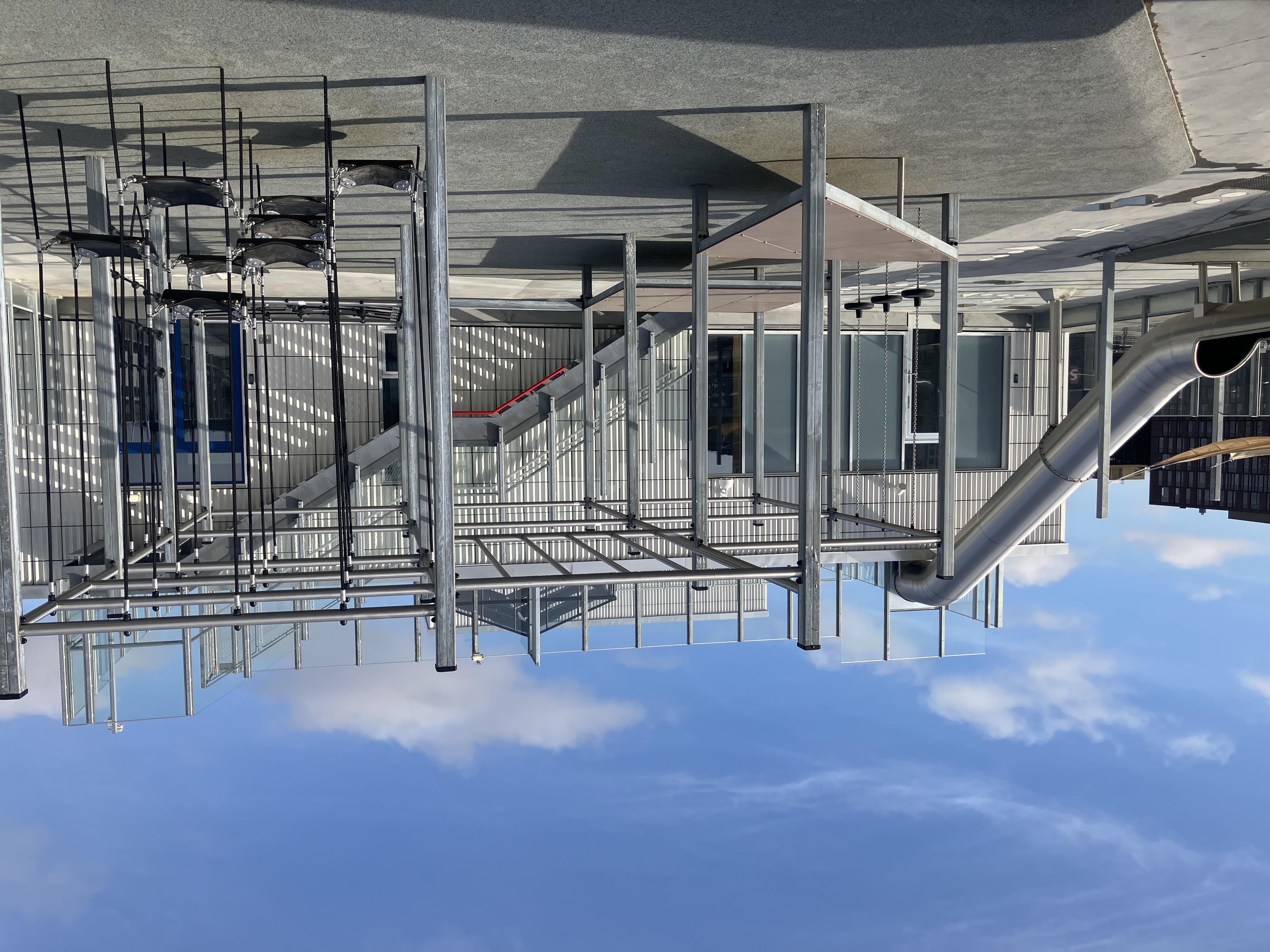 Tagterrasse med legepladsudstyr, inklusive en rutsjebane, klatrestativ og gynger.