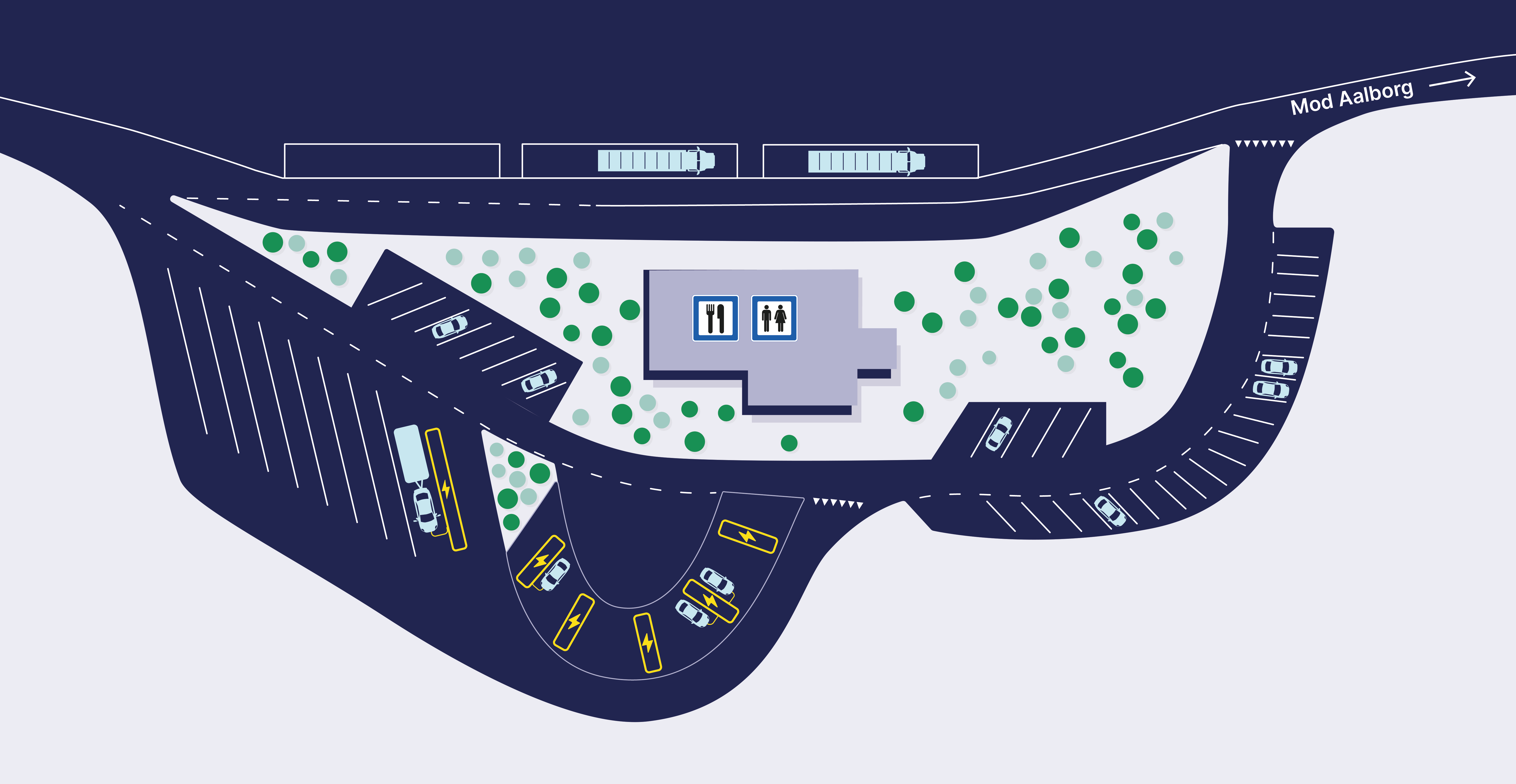 10 af de i alt 12 ladepladser er til personbiler, og de resterende to pladser er til lange køretøjer såsom personbiler med trailer eller campingvogn.