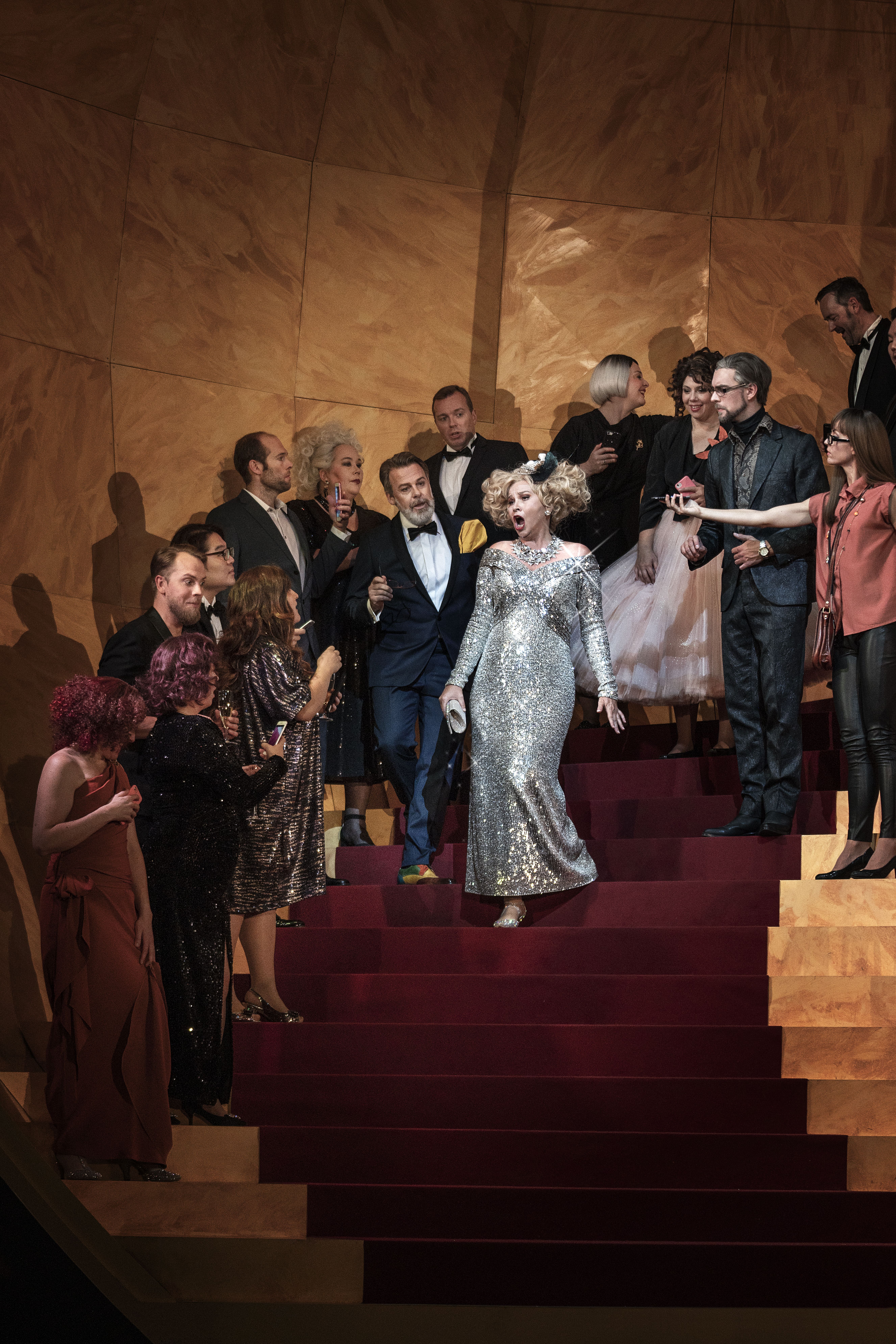 Den musikalske fest leveres af Det Kongelige Kapel, Det Kongelige Operakor og et stort hold operasolister, der giver de klassiske hits nyt liv. Morten Stauggard og Simon Duus kan på skift opleves i rollen som den desperate og forgældede Zeta. Lise Baastrup forsøger i rollen som teatrets knastørre djøffer Nielsen at få skik på Zeta, der er ude af kontrol, og den rige enke Hanna Glawari synges alternerende af Sine Bundgaard og Gisela Stille.