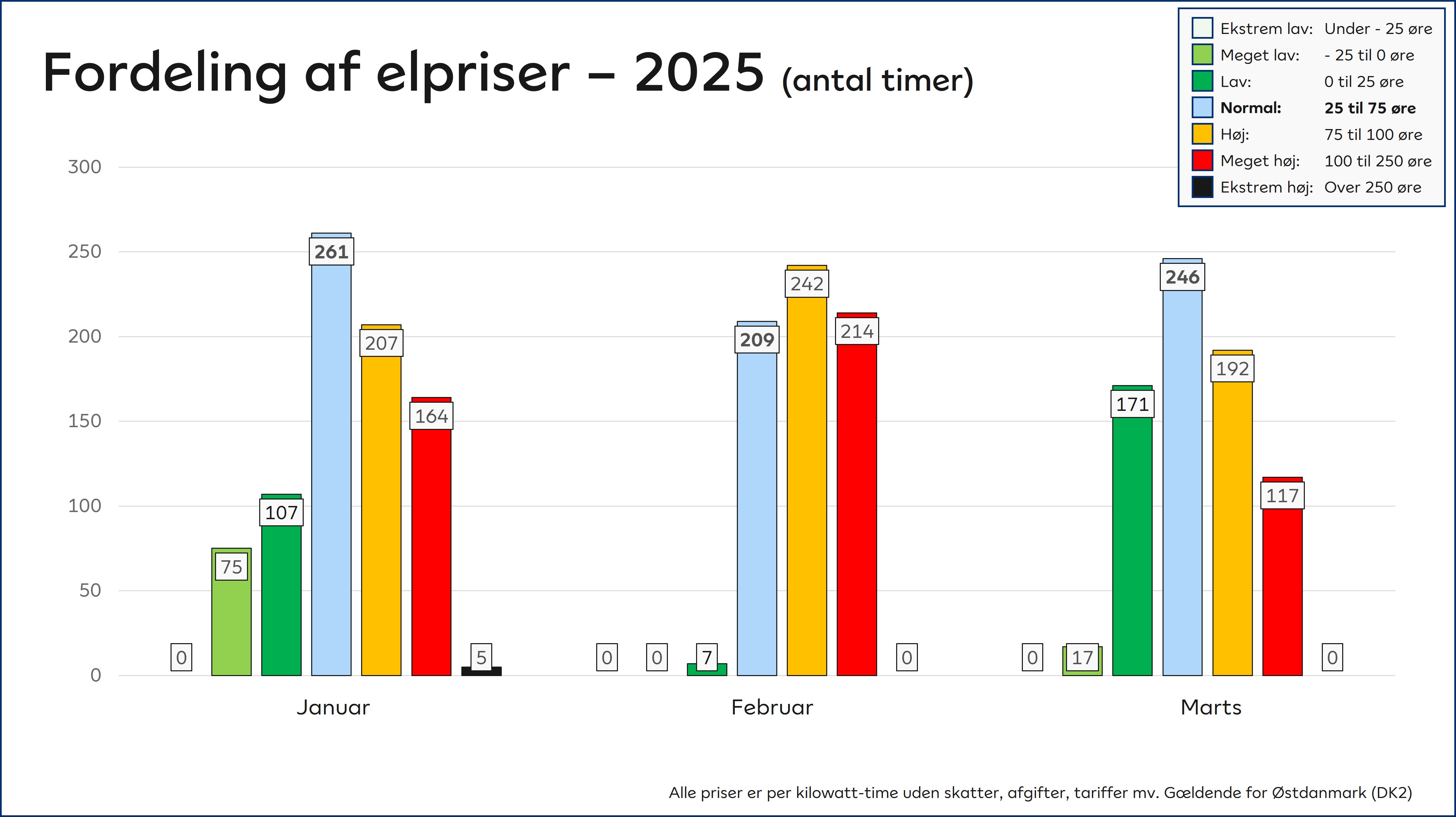 Elpriserne i marts nåede det generelt laveste niveau i fem måneder. Månedens gennemsnitspris på 61,76 øre pr. kilowatt-time uden alle skatter, afgifter, tariffer mv. er den laveste gennemsnitspris for en hel måned siden oktober 2024. Her var prisen ca. 57 øre.