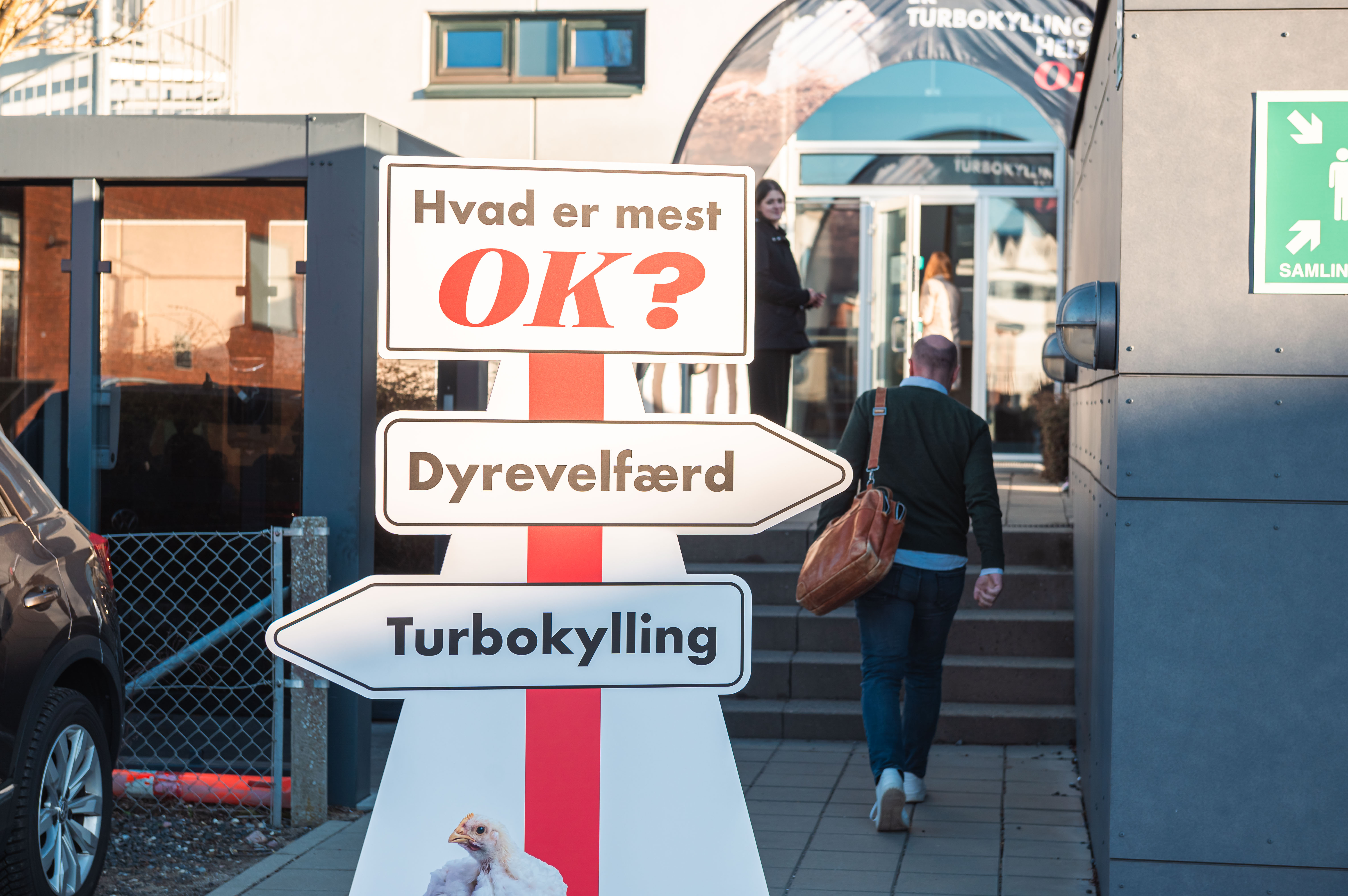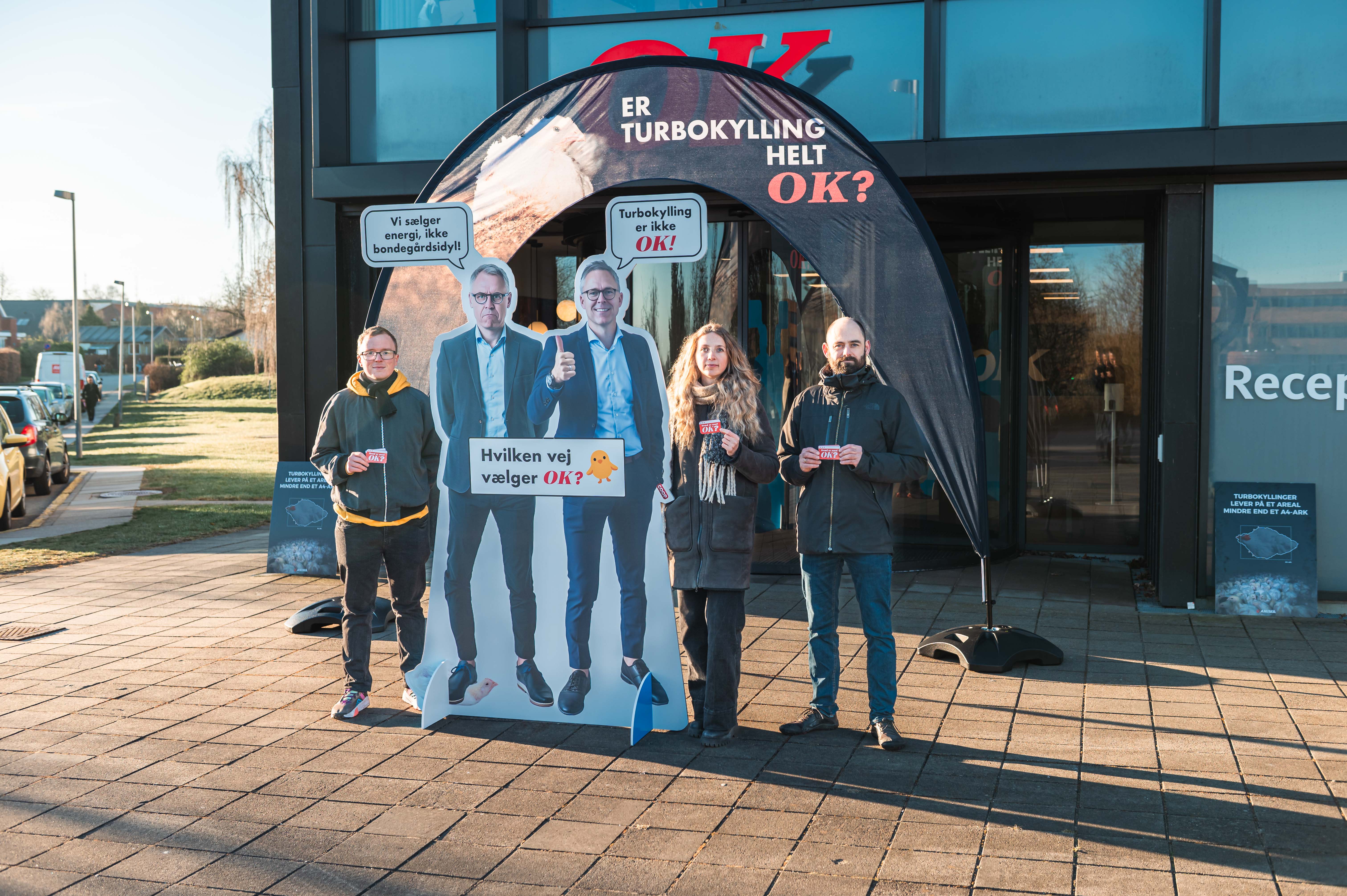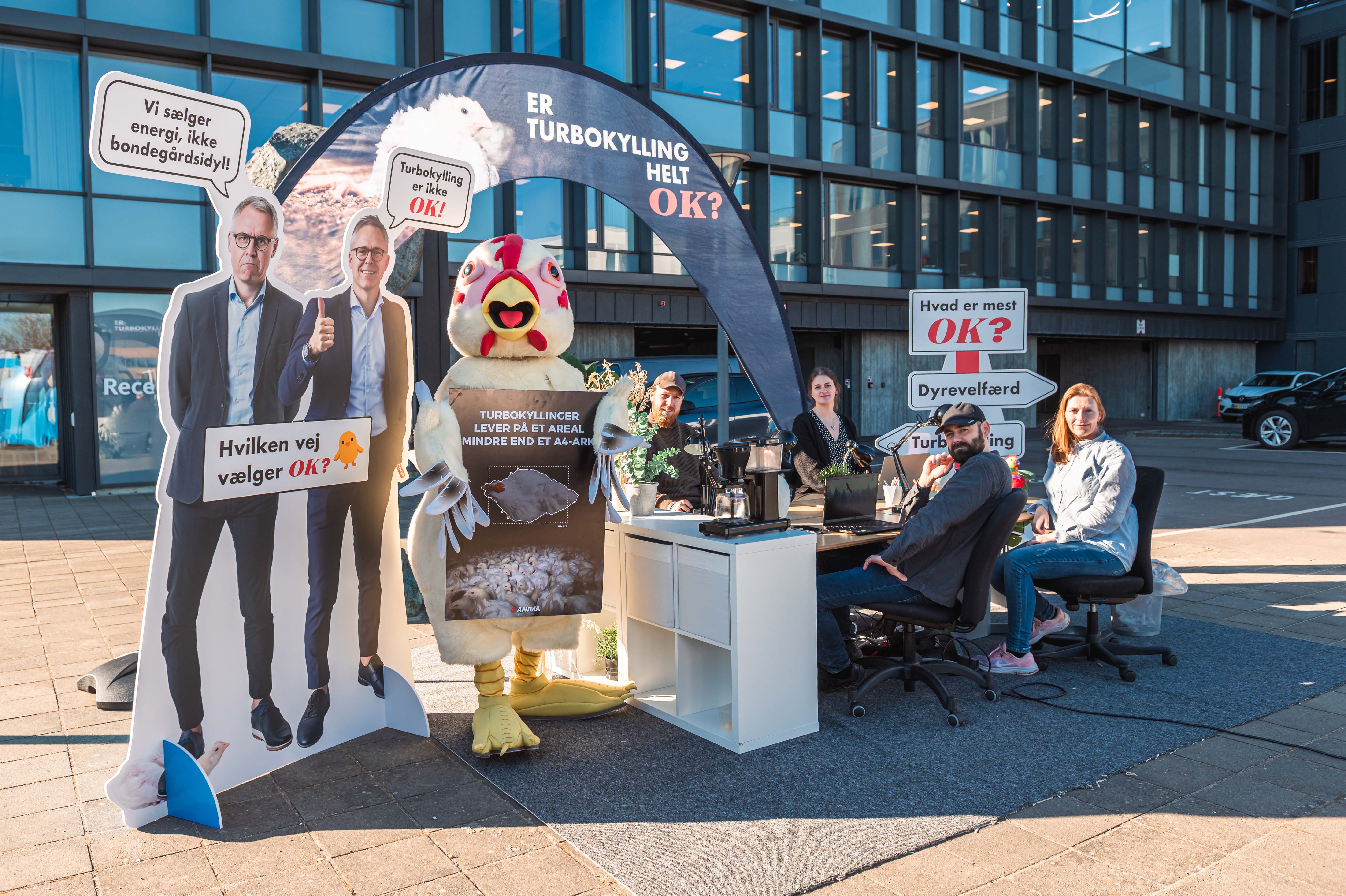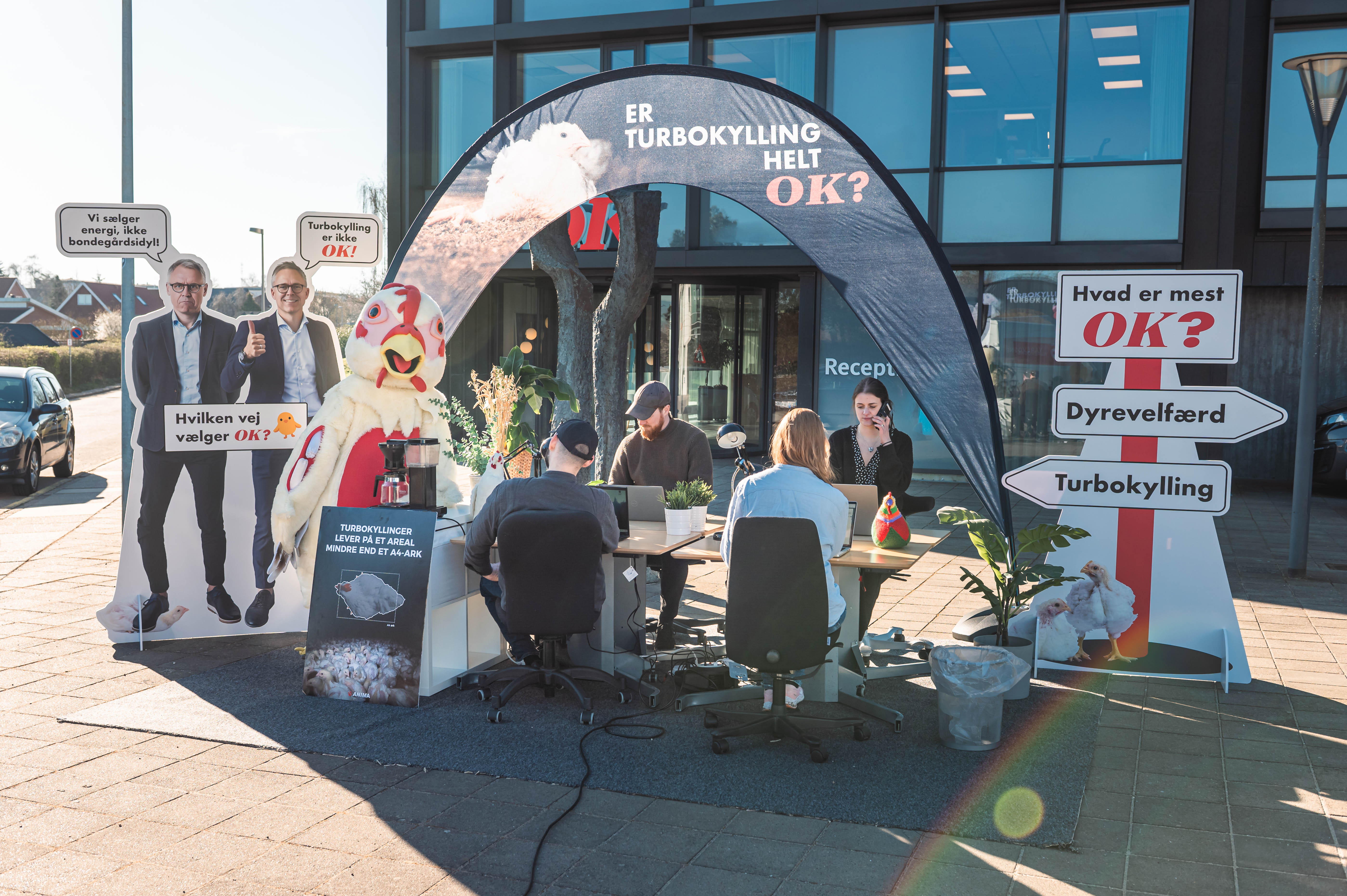 Dyrevenner i Anima er stået tidligt op for at tage imod alle OK’s medarbejdere med foldere og kyllingekager. Der er pyntet op med kæmpebannere og figurer af OK’s direktør Michael Løve i naturlig størrelse med spørgsmålet ”Er turbokylling helt OK?”. Derudover har Anima hyret det lokale bureau Detours til at lave et stort kunstværk af træ, som forestiller en turbokylling. Dette vil blive konstrueret lige foran hovedindgangen og doneret til OK. Tæt på dette har Anima opstillet et mobilt kontor, hvor medarbejdere og ledelse hos OK inviteres på dialogkaffe. Eventen finder sted både torsdag og fredag, og pressen er velkommen til at kigge forbi.