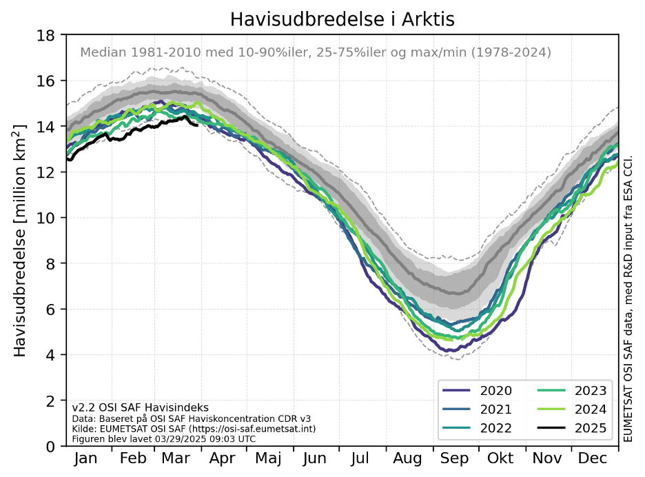 Den gennemsnitlige havisudbredelse for marts måned sætter en ny rekord som den laveste havisudbredelse nogensinde målt i marts. Marts måneds middeludbredelse blev målt til 14 millioner km2, som er 140.000 km2 mindre end den hidtidige rekord fra 2018. Det svarer til, at isen er svundet med et areal, der omtrent er på størrelse med England. Dagen hvor det gik fra frost til tø, og hvor den absolutte maksimumudbredelse fandt sted, var 14. marts. Her dækkede havisen 14,4 millioner km2 hav.