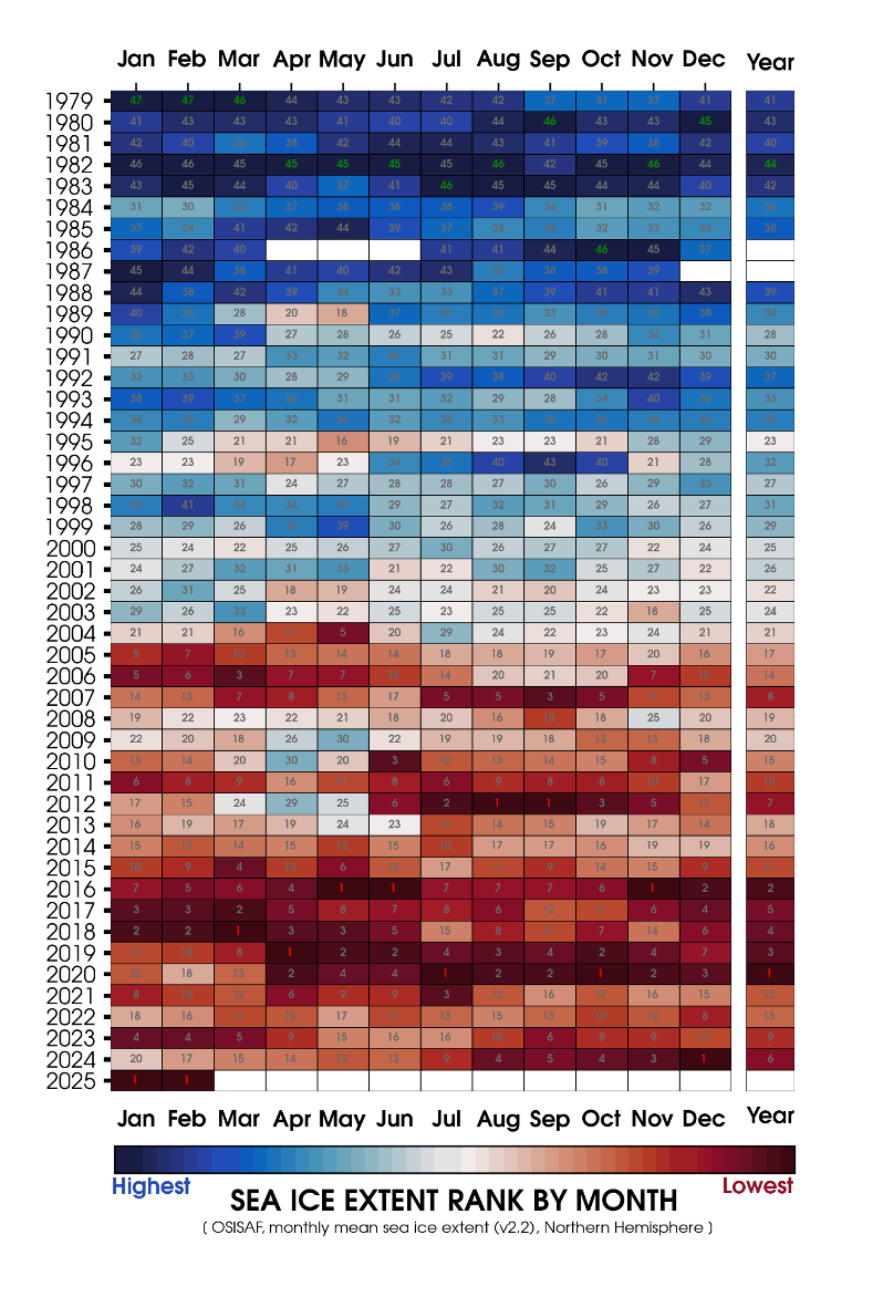En ’varm’ vinter i Arktis lakker mod enden og giver den laveste vinterudbredelse af havisen nogensinde målt. Omkring Antarktis kom havisudbredelsen ind som syvende laveste sommerudbredelse. Det er lavt, men trods alt knap så lavt som de foregående år.