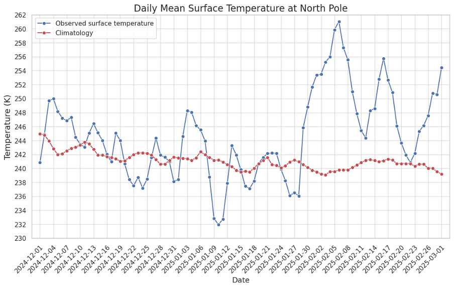 Lavtrykssystemer omkring Grønland har nemlig trukket varm luft fra Nordatlanten hele vejen til Nordpolen med det resultat, at temperaturerne har været 20-30 grader varmere, end det normalt ses i løbet af vinteren. På Nordpolen har temperaturen været helt oppe på omkring -10 grader, der er oplevet plusgrader i Longyearbyen på Svalbard, og der er registreret store varmeanomalier i Baffin bugten i løbet af marts måned.