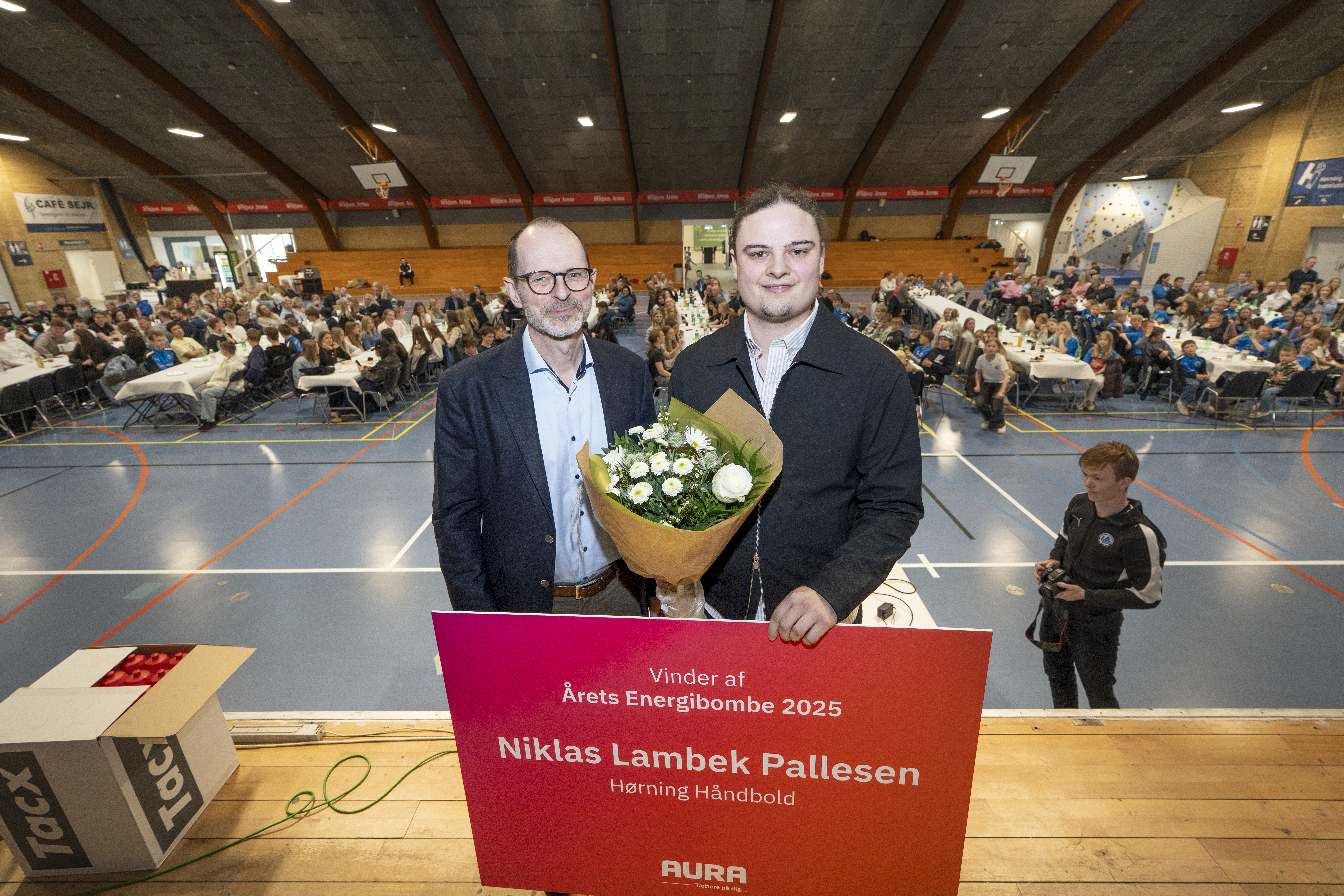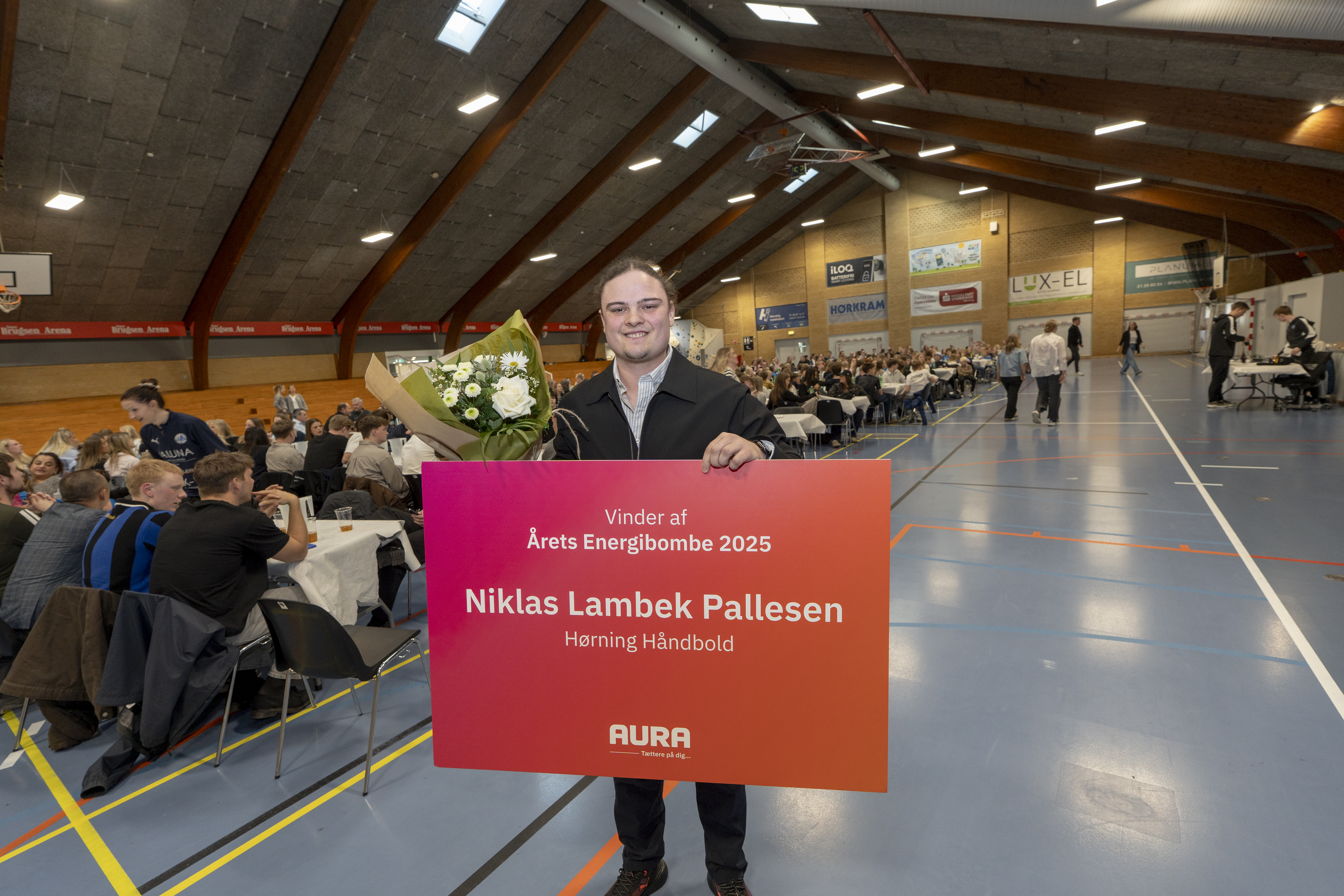 Fredag eftermiddag var over 300 medlemmer af Hørning Håndbold samlet i Hørning Idrætscenter til Hørning Awards. Men arrangementet fik en uventet start, da Carsten Höegh Christiansen, administrerende direktør i AURA, gik på scenen for at fortælle, at Niklas Lambek Pallesen har vundet afstemningen blandt AURAs andelshavere, og nu kan kalde sig Årets Energibombe.
