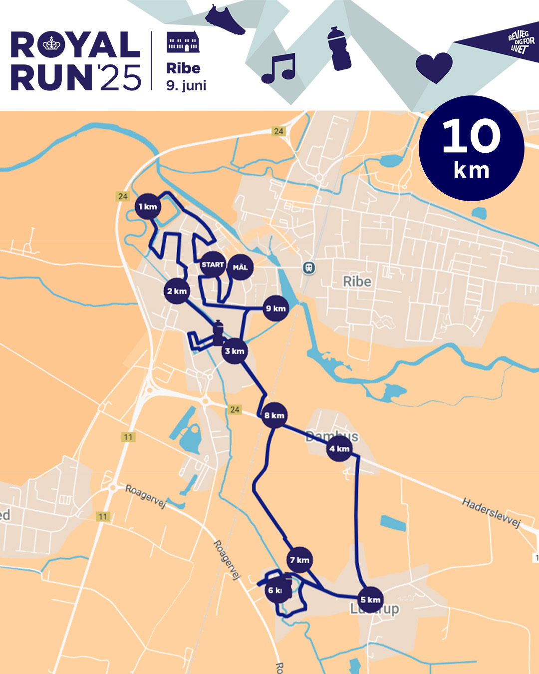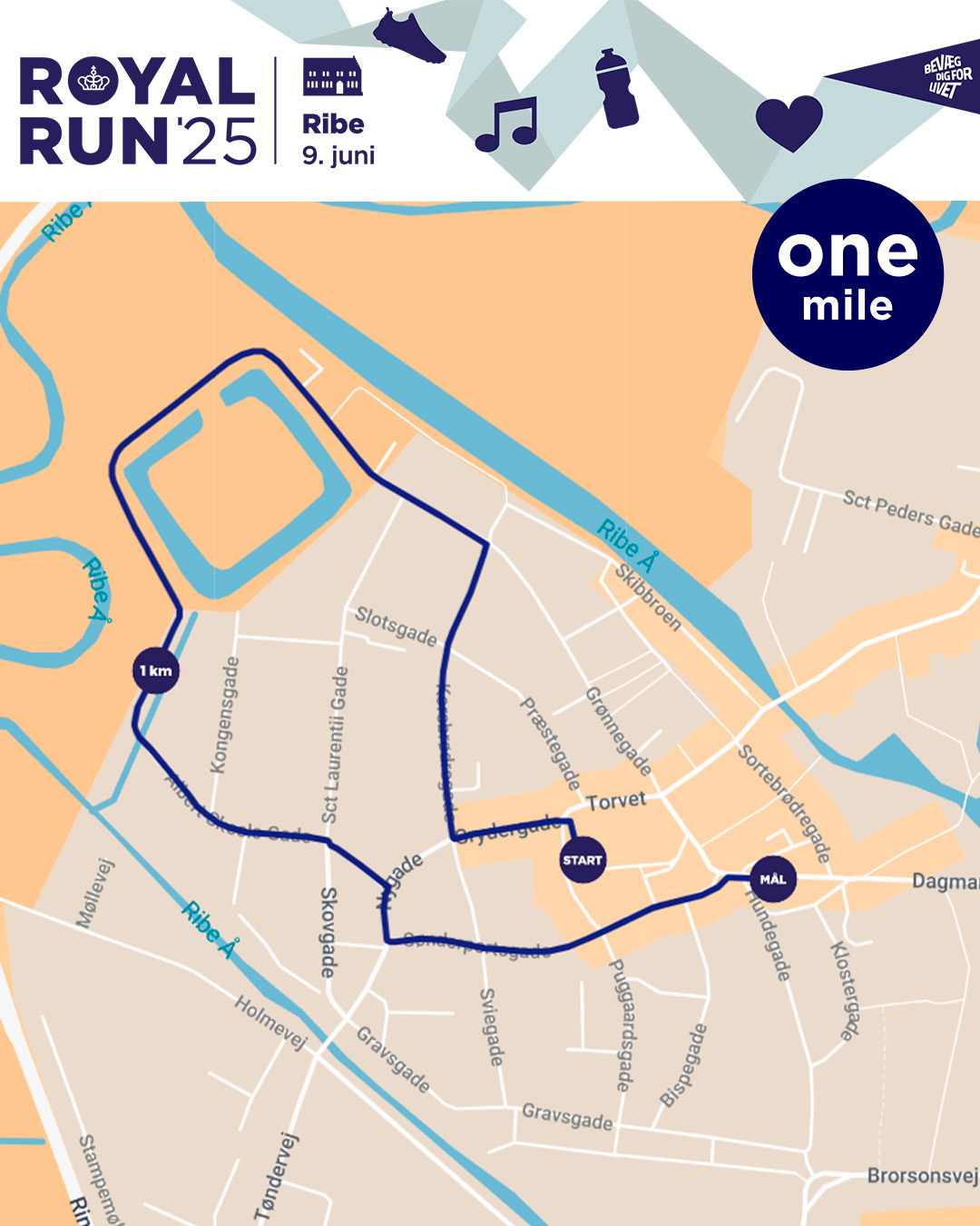 Det hele starter i hjertet af Danmarks ældste by, hvor Hans Majestæt Kongen skyder Royal Run 2025 i gang på Domkirkepladsen. Herfra går turen på alle tre distancer igennem den gamle bykerne til Riberhus Slotsbanke, hvor deltagerne for alvor mærker vingesuset fra den gamle kongebys historie. Mens One mile-ruten herfra krydser tilbage gennem byen mod mål, fortsætter 5’eren lidt længere rundt i den sydlige del af Ribe, og 10’eren slår et smut ud igennem Ribe VikingeCenter.