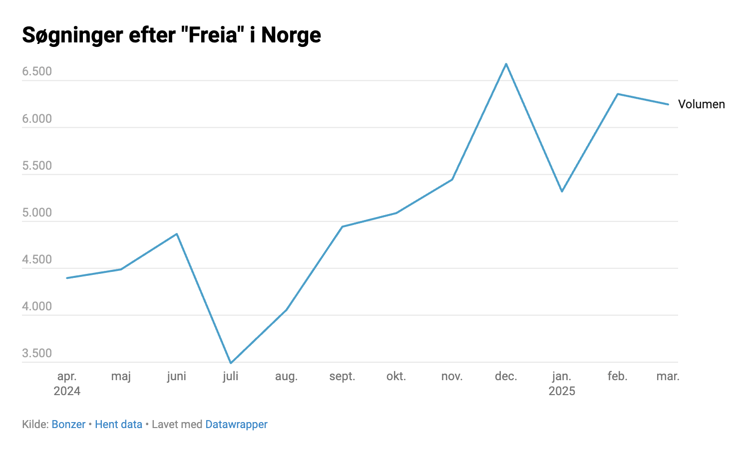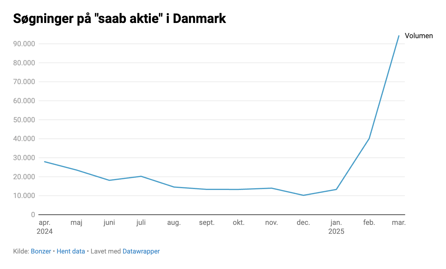 Svenske våbenaktier i høj kurs: Interessant nok ses en markant stigning i søgninger efter den svenske våbenproducent Saab i alle tre skandinaviske lande (Norge +30%, Sverige +114%, Danmark +237%), hvilket indikerer en bredere interesse for regional sikkerhed og selvstændighed.