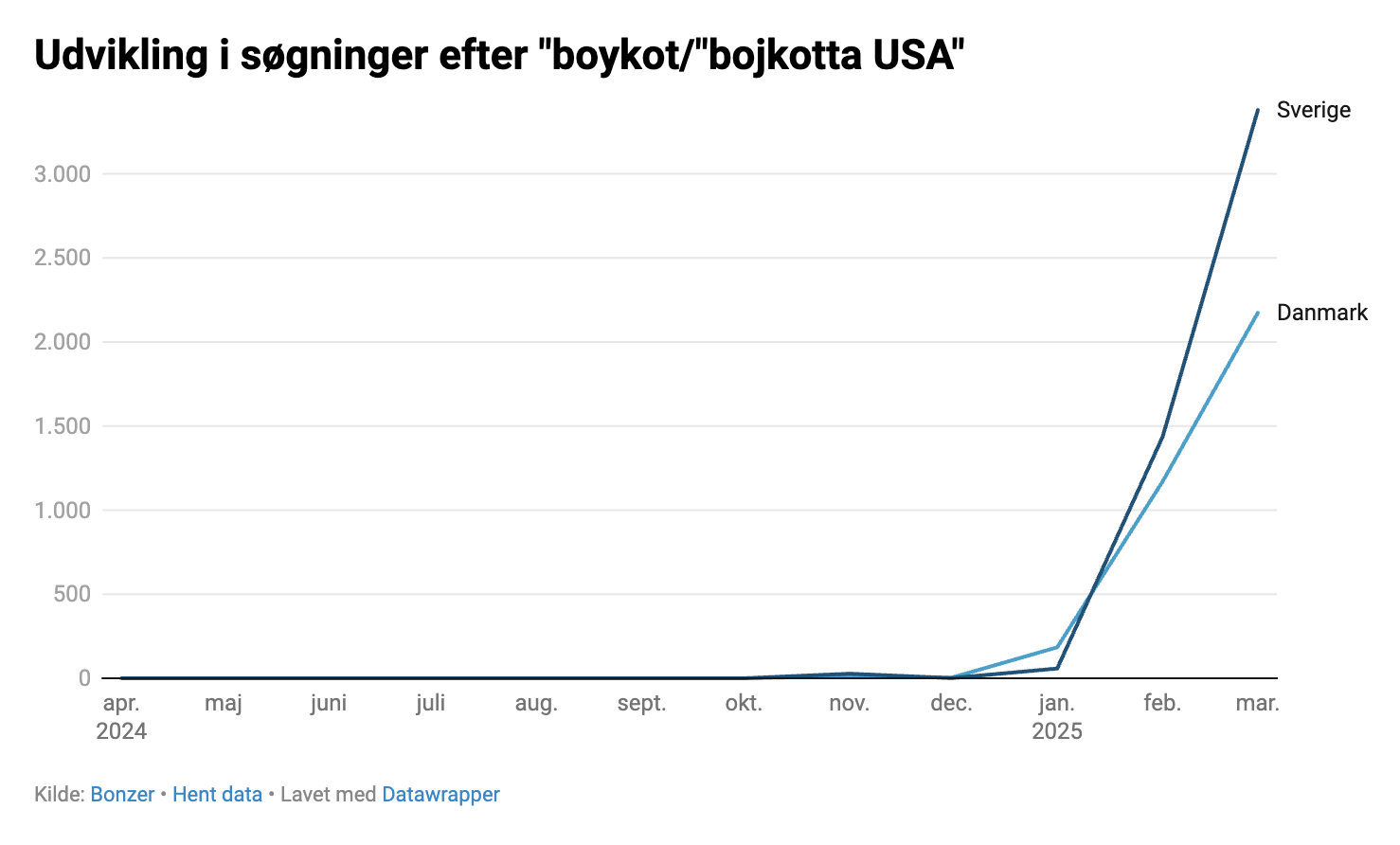 I Danmark er søgninger på "boykot USA" eksploderet fra næsten ingen registreringer i december til hele 2.175 i marts 2025. Sverige viser en lignende tendens med 3.381 søgninger på "bojkotta USA" i samme periode. Det viser ny søgemaskine-data i en netop publiceret analyse fra SEO-bureauet Bonzer.