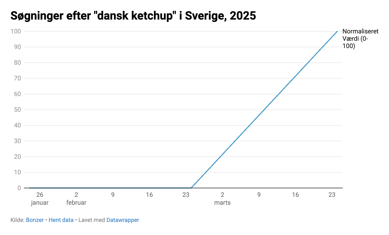 Svenskerne har fået smag for dansk ketchup: Søgninger efter "dansk ketchup" i Sverige er steget eksplosivt, mens interessen for amerikanske mærker som Heinz er faldet.