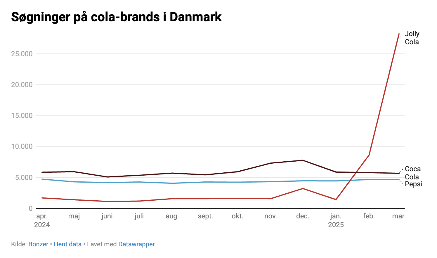Danskerne foretrækker Jolly Cola over både Coca Cola og Pepsi: Søgninger efter den danske sodavand er steget med hele 1.550% i marts 2025 sammenlignet med året før, hvilket indikerer en klar præference overfor amerikanske giganter som Coca Cola og Pepsi.