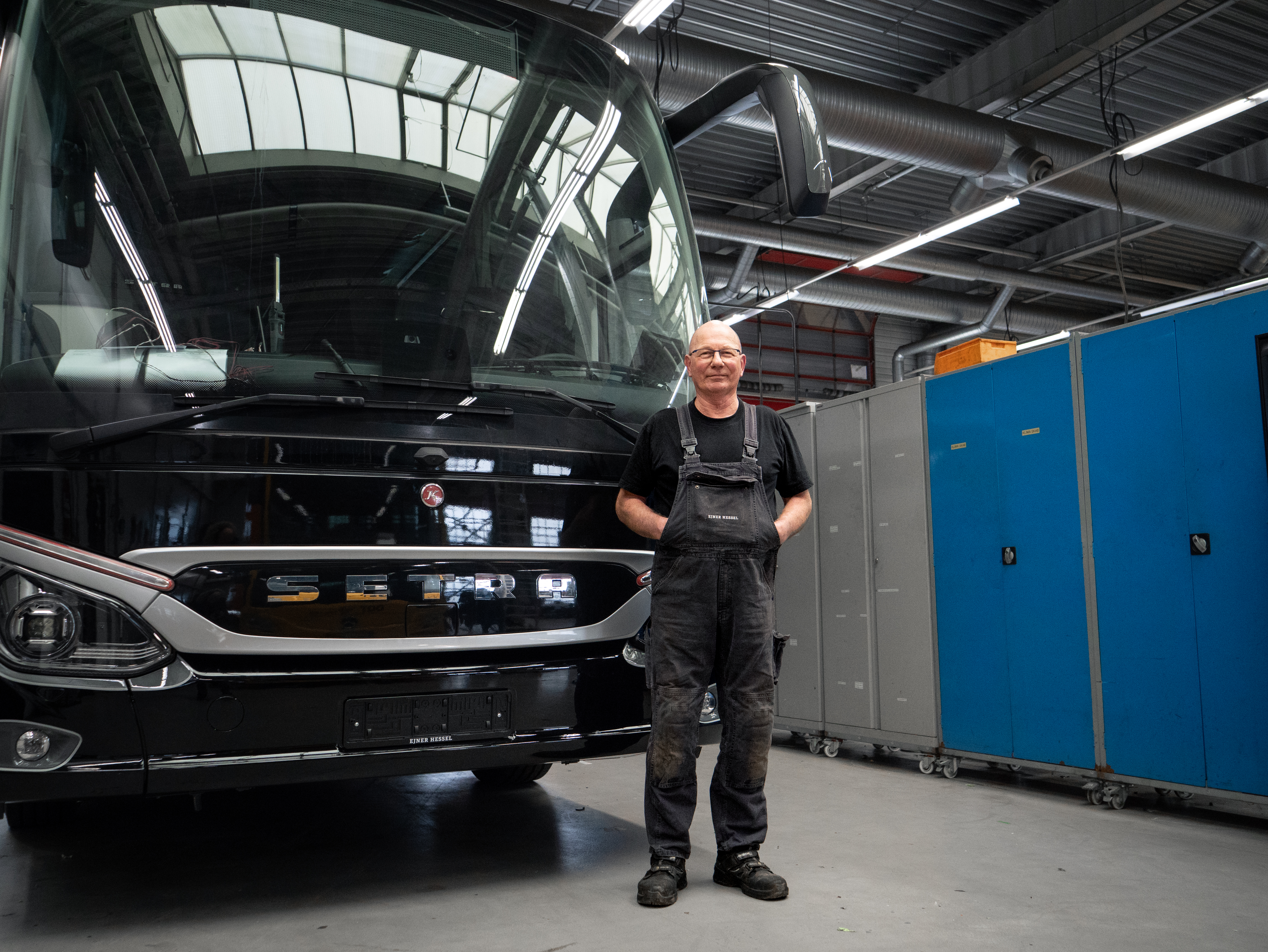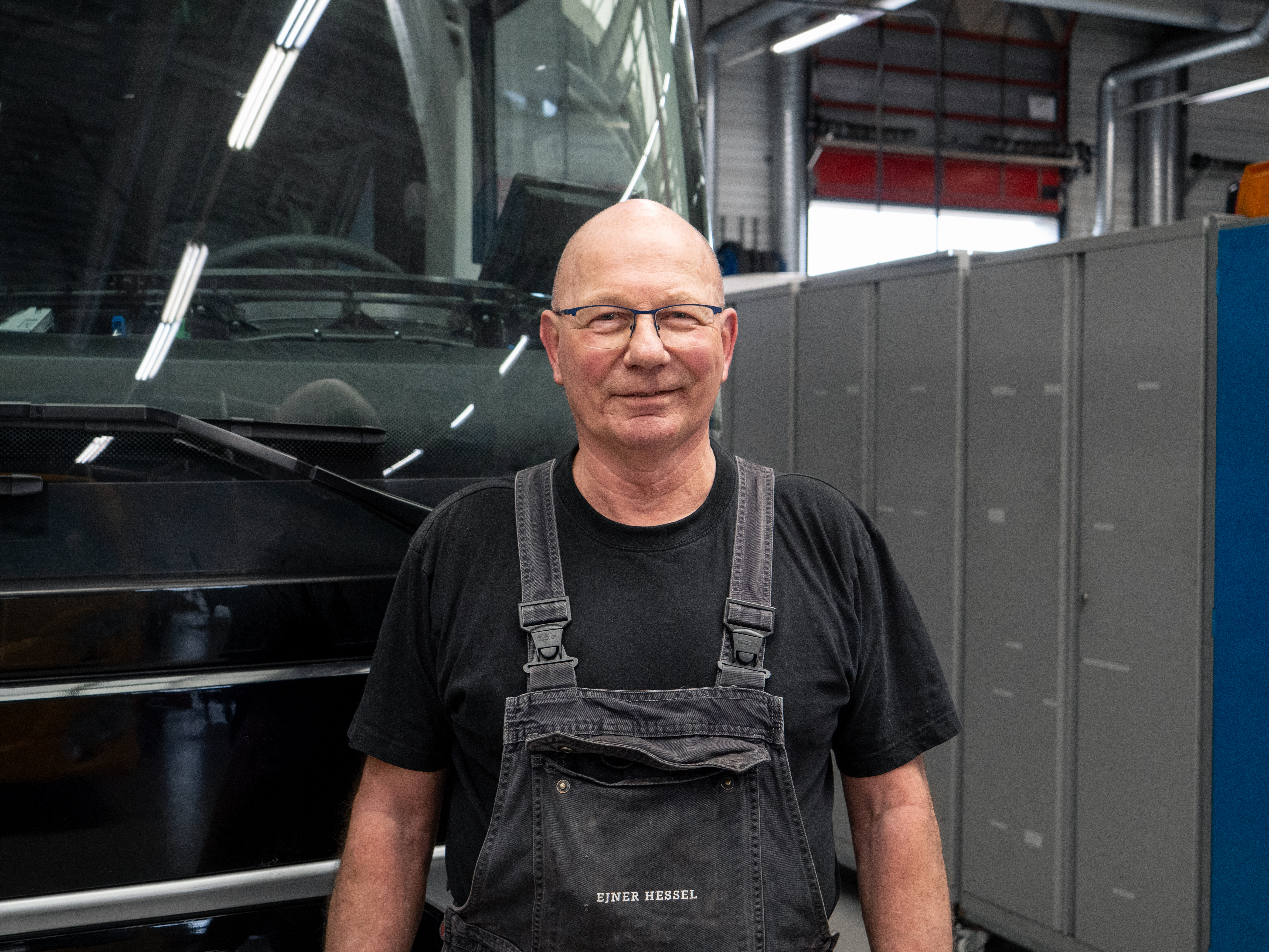 Søren Bing Poulsen startede i lære tilbage i 1967 og indledte sin mekanikerkarriere med at skrue i Volvo lastbiler. Siden har han arbejdet mange forskellige steder – blandt andet hos Københavns sporveje, Scania i Roskilde og Arriva i Slagelse. Han har altid haft hænderne i de store køretøjer, og de sidste 20 år har han primært arbejdet med Mercedes-Benz og Setra busser hos Evo Bus A/S, som i 2023 blev købt og overtaget af Ejner Hessel A/S.
