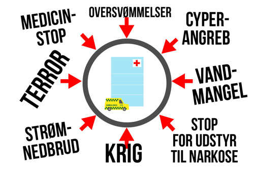 En stor krise med energimangel, optrappet konflikt i Europa eller en ny stor pandemi vil stille hidtil usete krav til sundhedsvæsenet. Hospitaler risikerer at stå uden faste leverancer af medicin og udstyr, og der kan mangle bl.a. strøm, vand og internet.