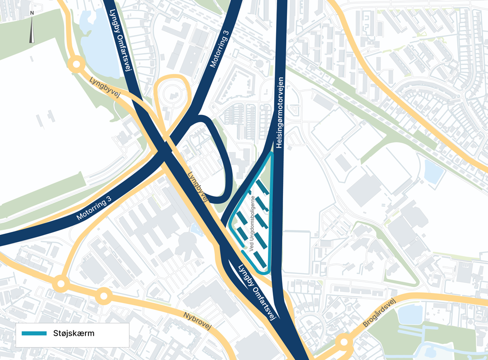 Vejdirektoratets entreprenør går efter påske i gang med at etablere en støjskærm langs Helsingørmotorvejen, Lyngbyvejen og Lyngby Omfartsvej. Støjskærmen kommer til at indhegne området Ved Ungdomsboligerne, der ligger i en kvadrant mellem de tre store færdselsårer i udkanten af Kongens Lyngby, i Gentofte Kommune. I den forbindelse sker der en trafikomlægning.