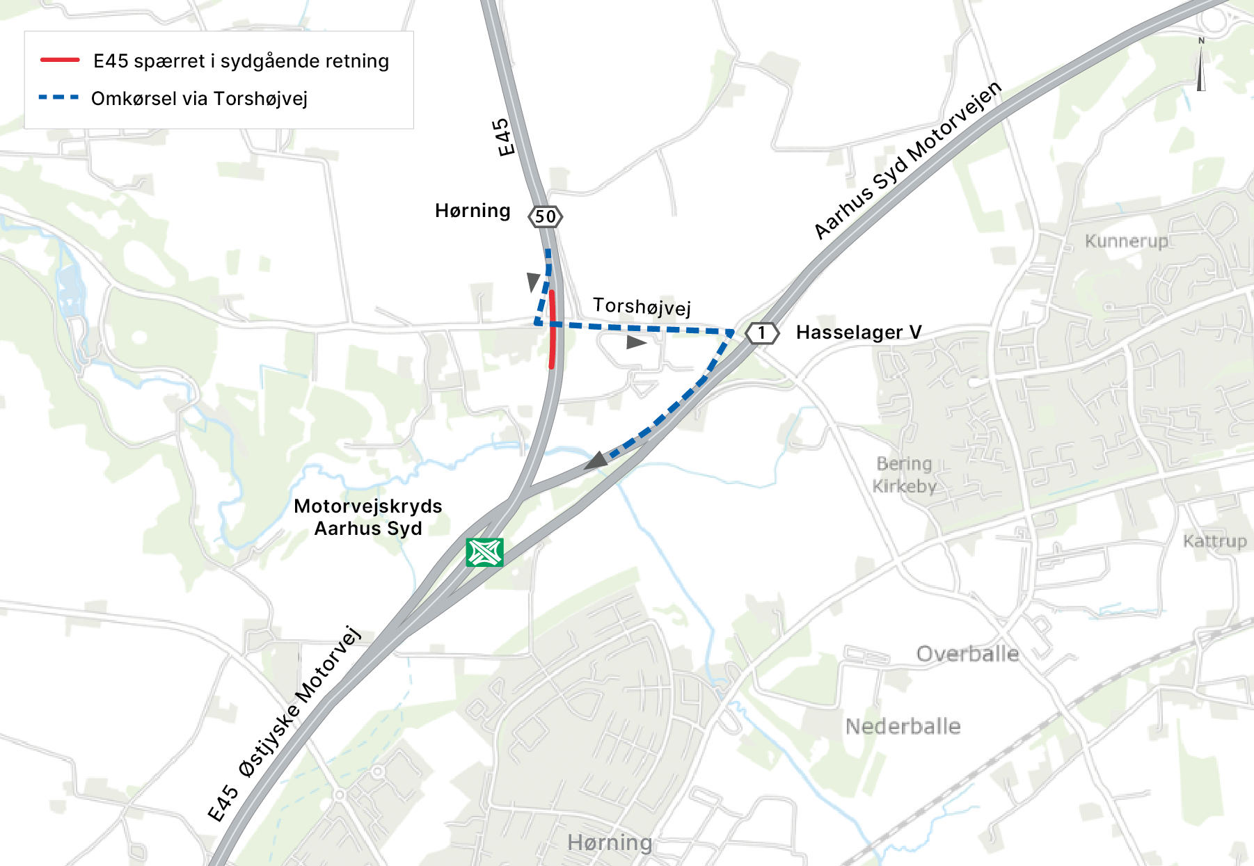 Trafikanter i sydgående retning på E45 Østjyske Motorvej må ud på en mindre omkørsel, da motorvejen spærres forbi <50> Hørning i weekenden fredag den 25. april til mandag den 28. april.