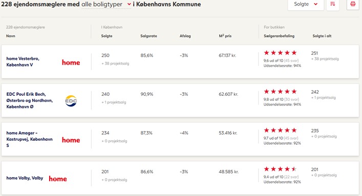 Ejendomsmæglerkæden Home sidder nu på 3 af de 4 øverste pladser med ejendomsmæglerbutikker, der sælger flest boliger i Københavns kommune