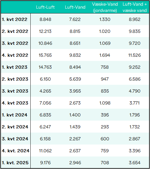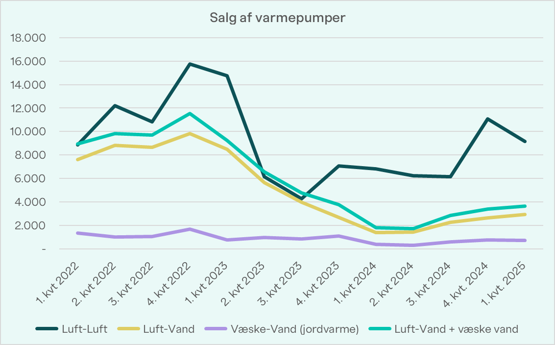 Flere danskere har nu igen fået øjnene op for varmepumper, efter en hård periode hvor salget faldt markant på grund af faldende gaspriser, usikkerhed om fjernvarmeudrulning og inflation. Salget er fordoblet fra 1.795 i første kvartal 2024 til 3.654 solgte vandbårne varmepumper i samme periode i 2025. Der er dog stadig langt op til rekordåret 2022.