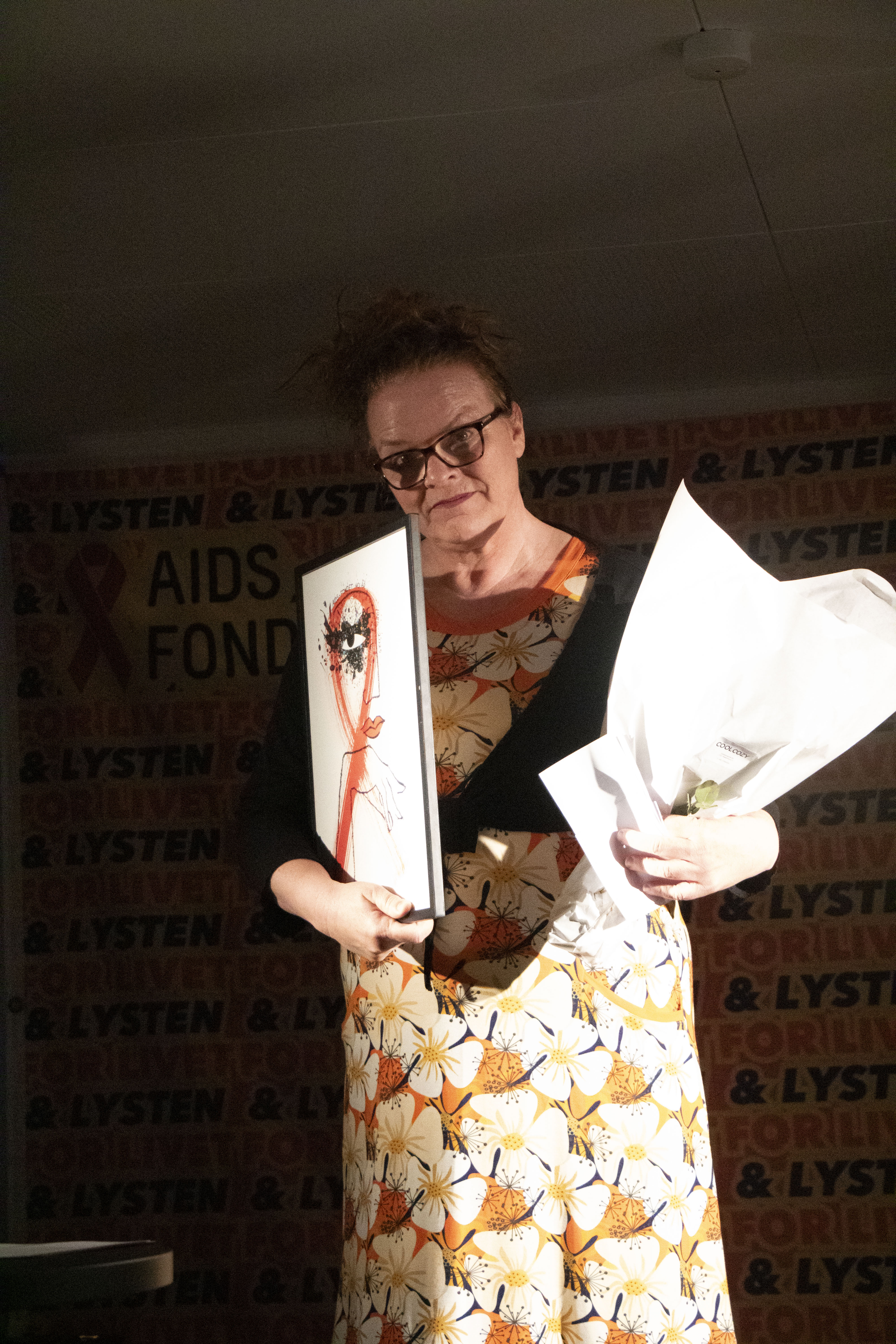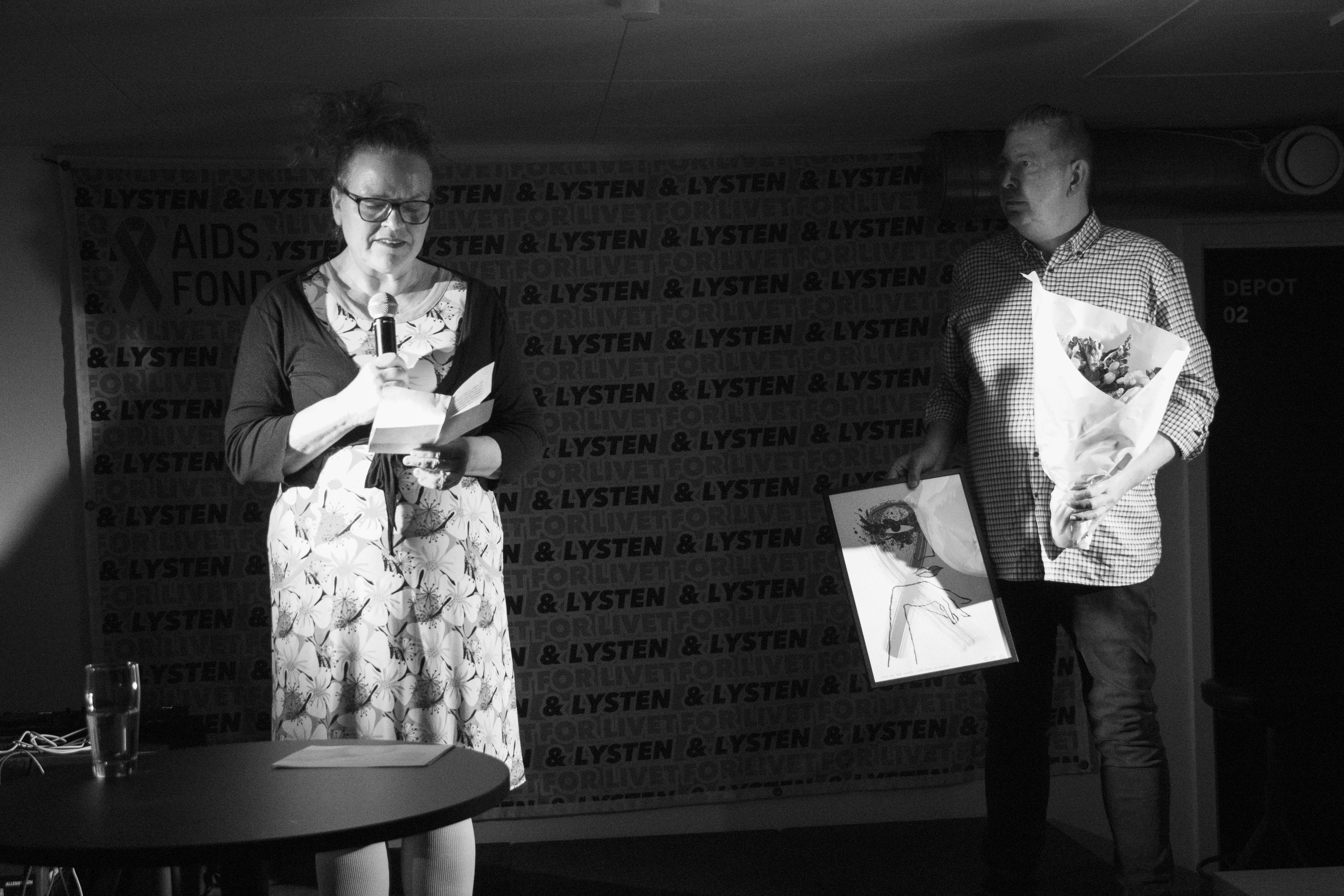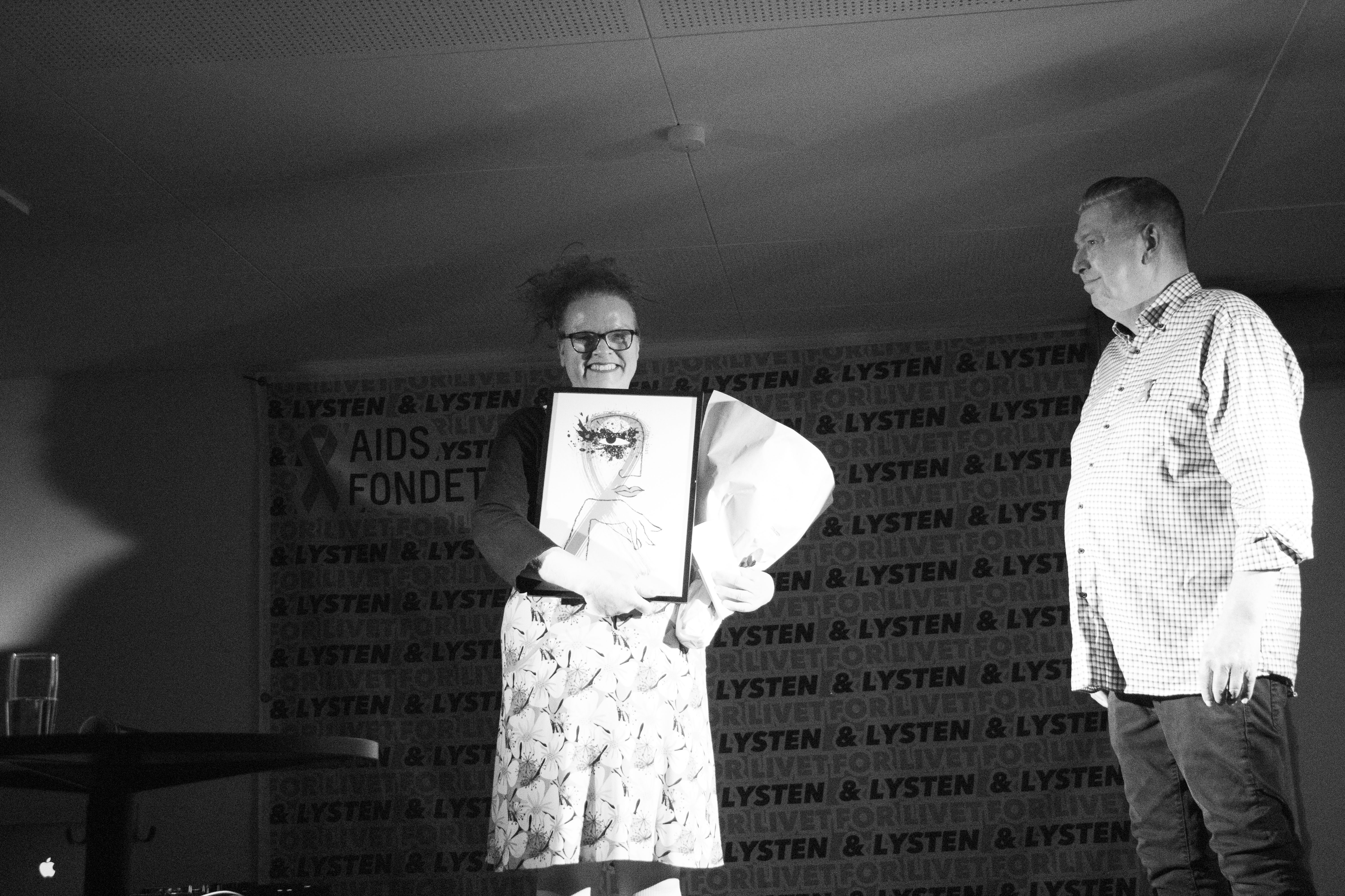 Prisen: Prismodtagerne fik en buket blomster og et unikt kunstværk, som er skabt af kunstneren Thomas Winkler i anledning af AIDS-Fondets 40-års jubilæum.