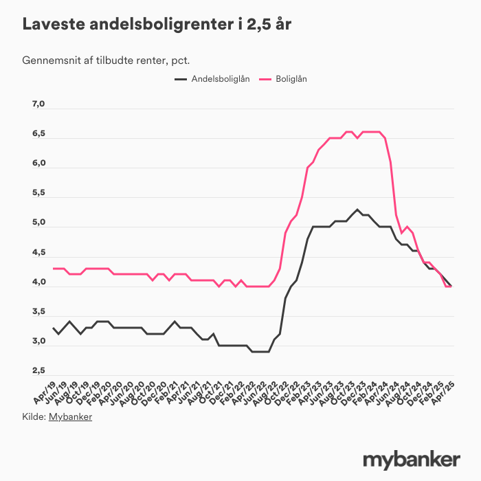 April måned bød på et nyt fald i bankernes rente på andelsboliglån, der nu er på det laveste niveau siden oktober 2022. Det viser denne måneds rentestatistik fra Mybanker.