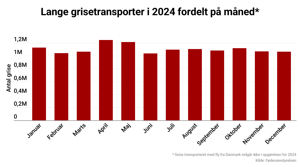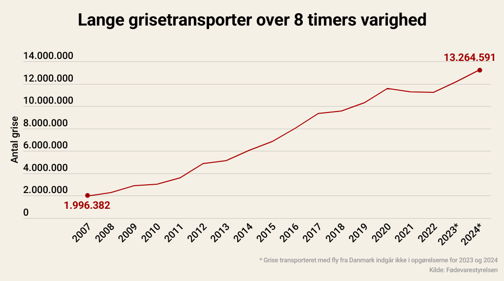 I 2024 blev flere end 16,7 millioner levende grise eksporteret fra Danmark, heraf over 13 millioner på lange transporter af mere end otte timers varighed. Og her tælles grise, der er transporteret med fly fra Danmark, endda ikke med.