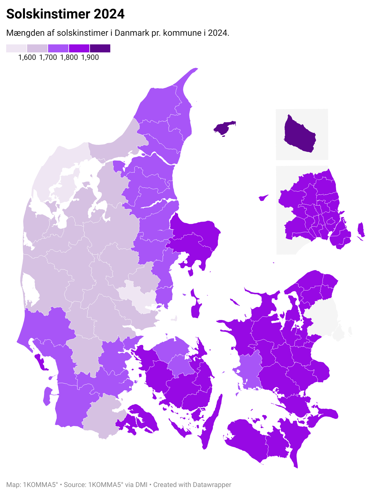 Ikke overraskende er det den lille solskinsø i Østersøen, hvor solen skinner mest. I Bornholm Kommune skinnede solen nemlig i alt 1.989,1 timer i løbet af 2024. Det viser en opgørelse fra DMI, som cleantech-startuppen 1KOMMA5° Danmark har fået indsigt i.