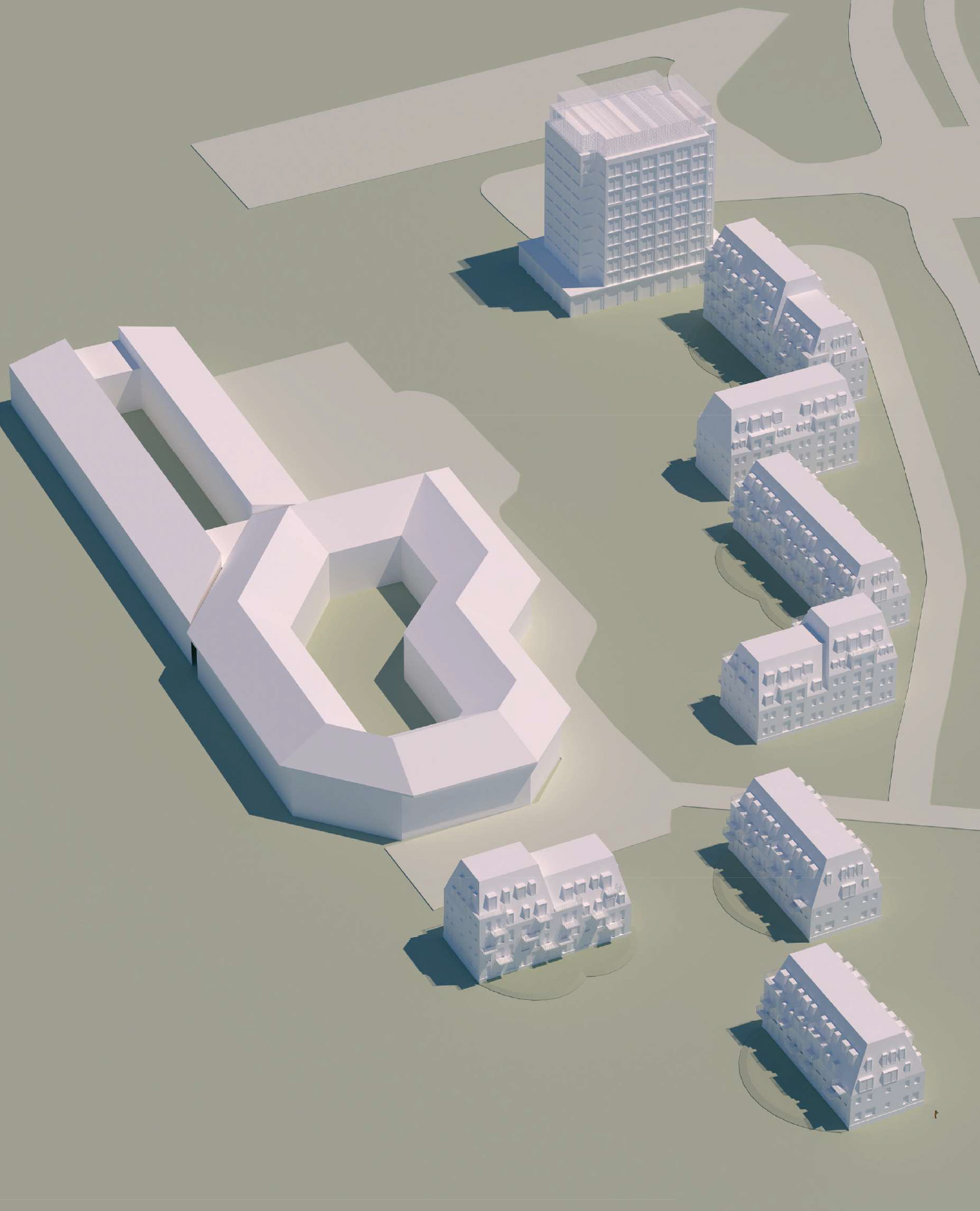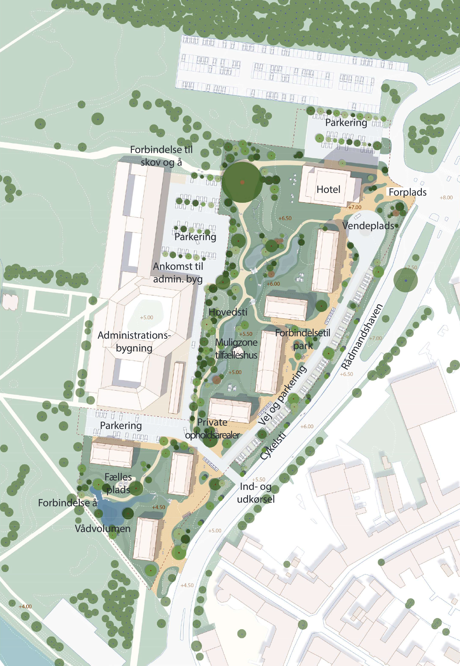 Udviklingsselskabet har fremlagt et projektmateriale for byrådet, der giver plads til hotel med 120 værelser i max 12 etagers højde, 140 etageboliger og en bypark mellem administrationsbygningen og hotellet og boligerne, som samtidig trækker det eksisterende grønne område tættere på bymidten.