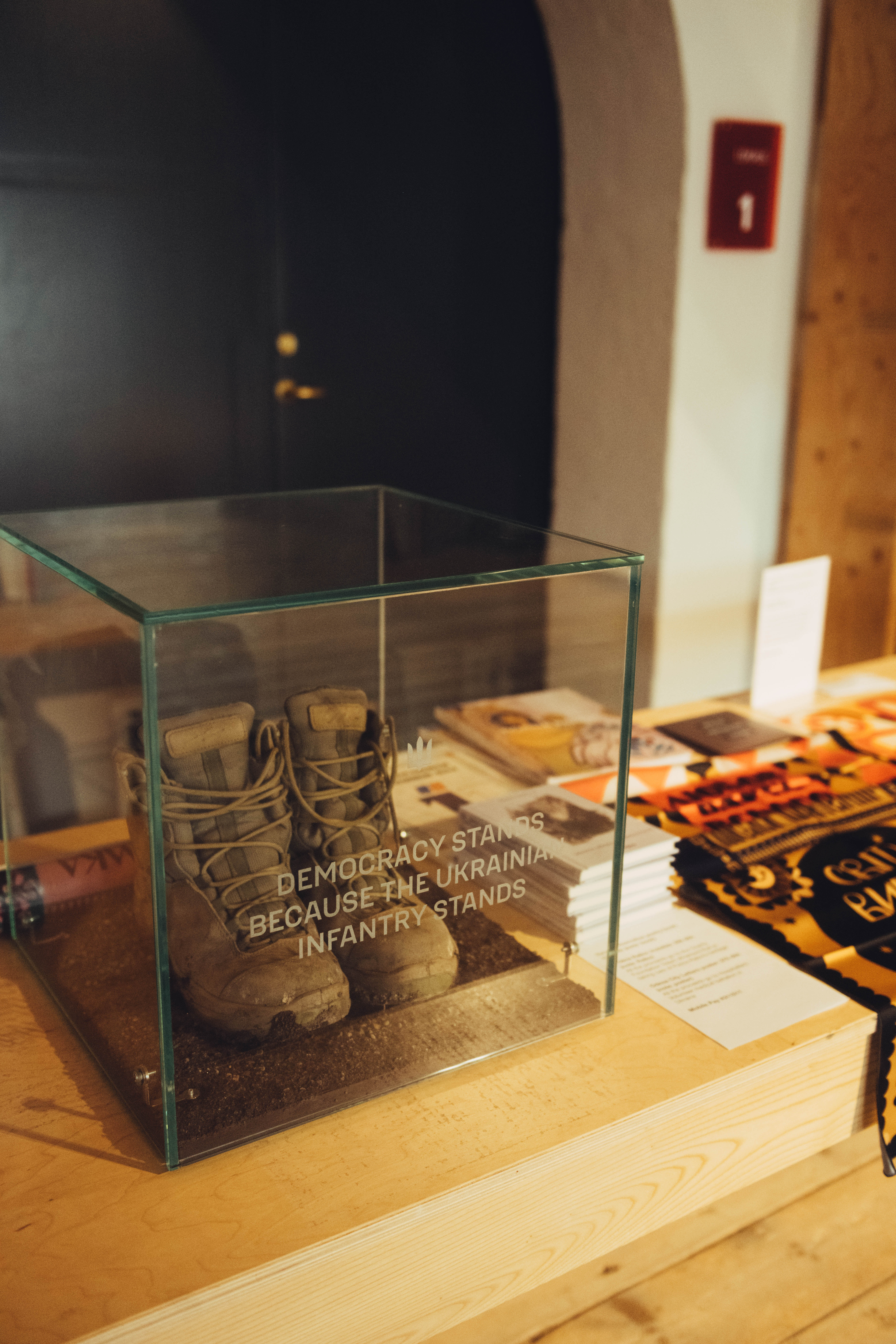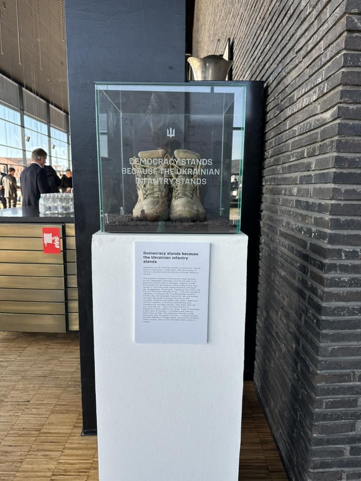 At the entrance of CDS 2025, Ukraine House in Denmark, in partnership with the Embassy of Ukraine, presented a modest but powerful installation by the Ukrainian Infantry: “Democracy stands because the Ukrainian infantry stands.” It featured combat-worn boots from the frontline—not parade boots like those seen on Red Square, but real, battered ones, marked by mud and fire. The boots are silent witnesses to sacrifice, and a reminder that freedom never defends itself. Someone always does.