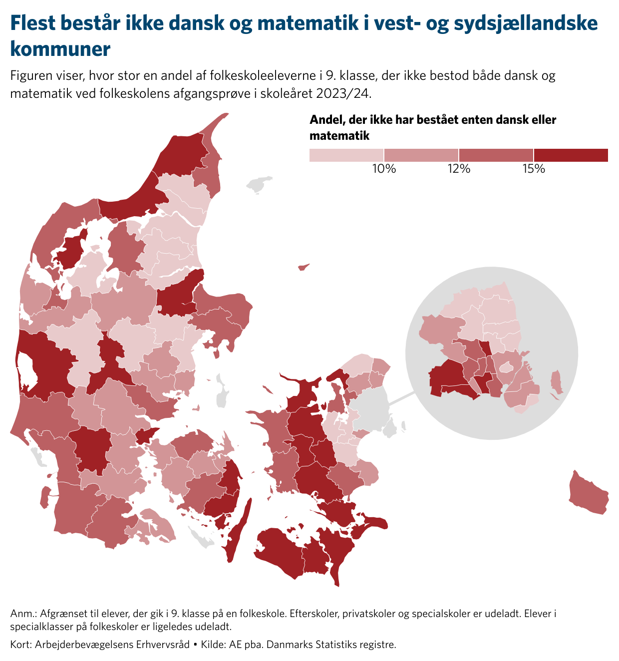 Andelen er også høj i en række sjællandske kommuner som Ishøj, Halsnæs, Odsherred, Ringsted, Vordingborg og Guldborgsund, der har det til fælles, at mere end 20 procent af eleverne ikke bestod.