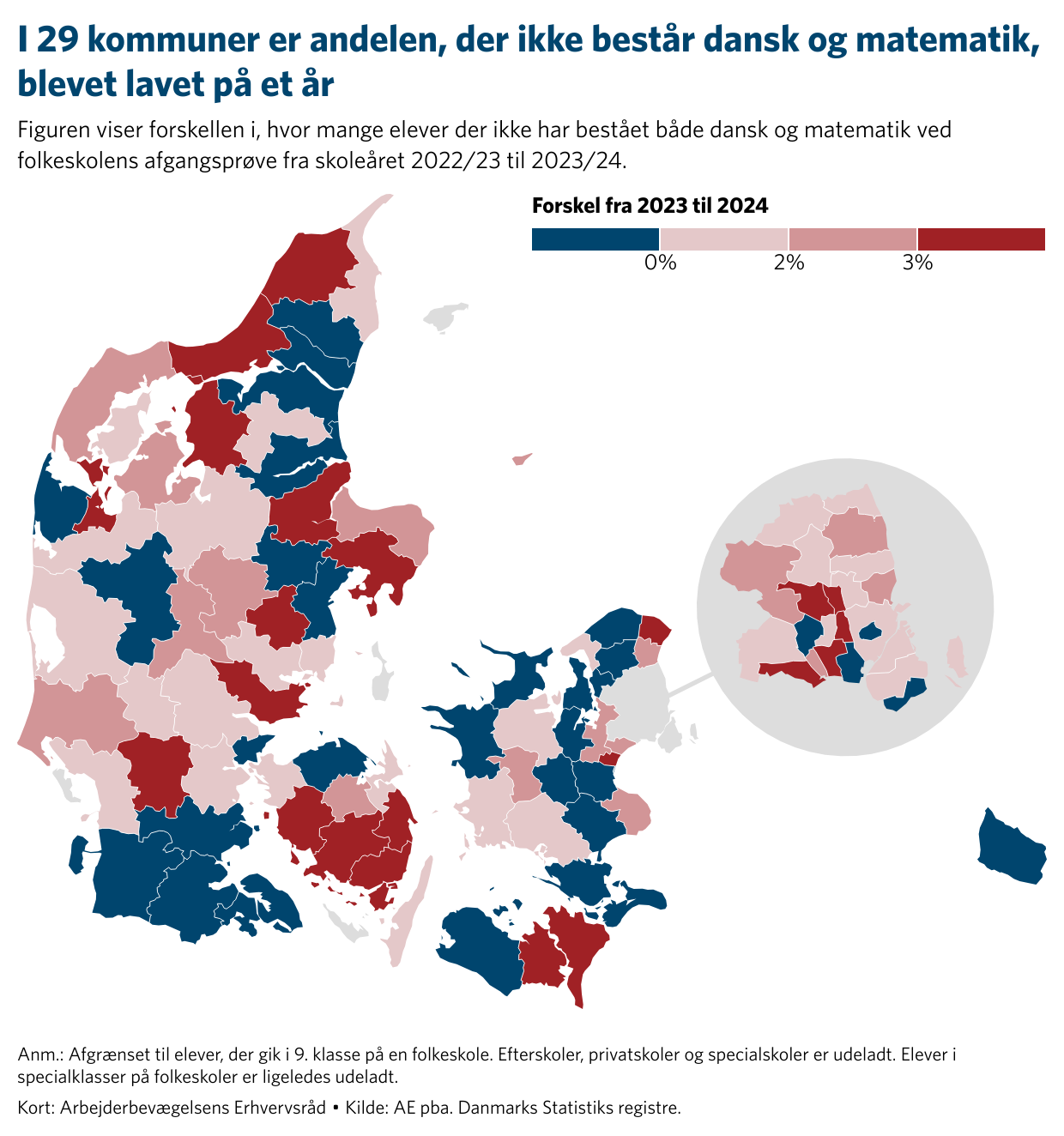 I 65 kommuner steg andelen af elever, der ikke bestod enten dansk eller matematik, fra skoleåret 2022/23 til skoleåret 2023/24.