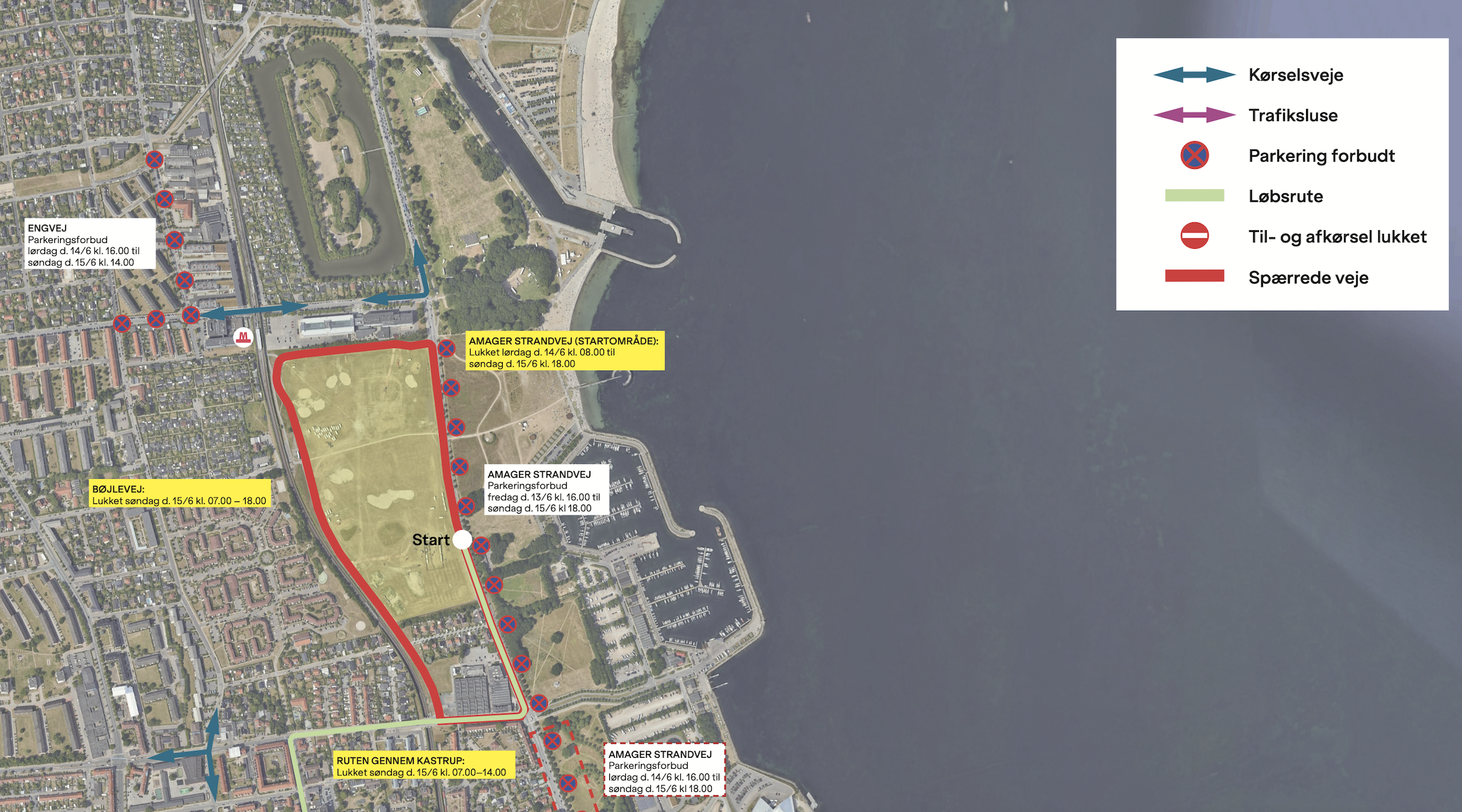 På flere strækninger er der forbud mod parkering lørdag og søndag, på Amager Strandvej allerede fra fredag d. 13. juni. Hold øje med skiltningen i gaderne. Ulovligt parkerede biler kan blive fjernet for ejers regning
