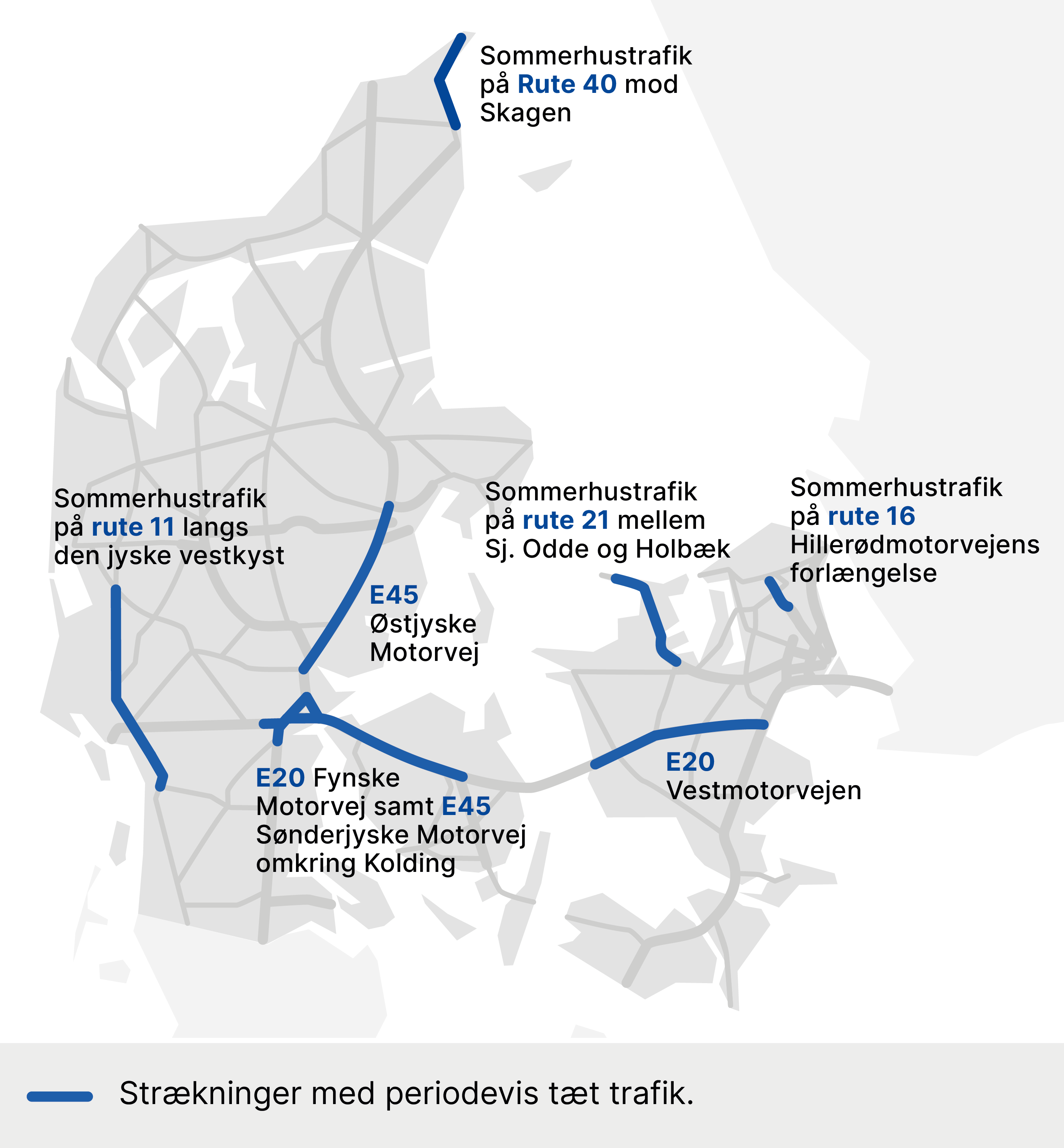 Derudover forventes der også tæt trafik på rute 16 Hillerødmotorvejens forlængelse, rute 21 mod Sj. Odde, rute 11 ved den jyske vestkyst mellem Ribe og Ringkøbing og rute 40 til og fra Skagen.