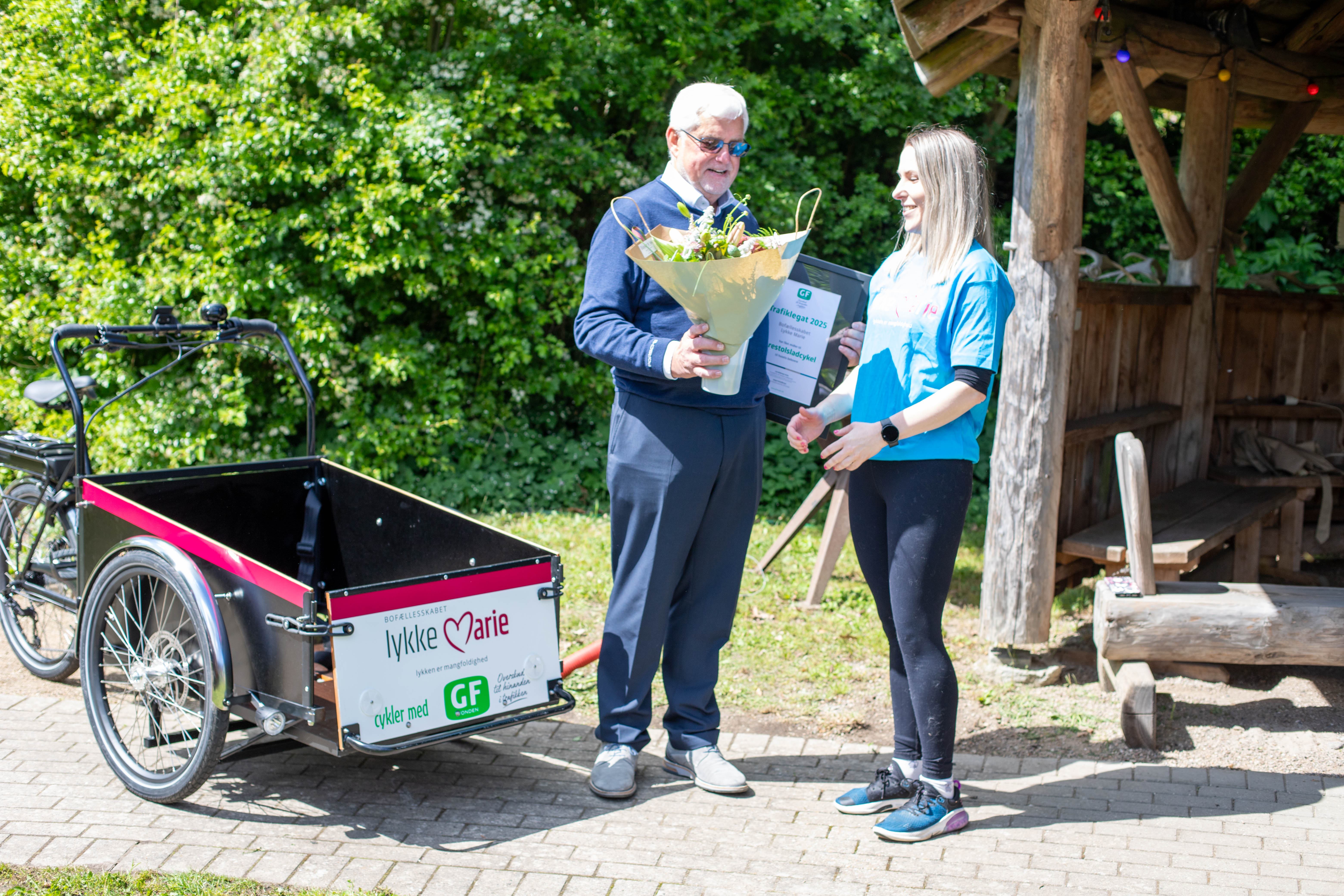 - Ansøgningen fra Lykke Marie ramte os lige i hjertet. Med kreative indsatser har de bevist, at cykling er for alle, og at det kan lade sig gøre at få flere til at cykle mere. Derudover kan det være til stor inspiration for andre bofællesskaber. Derfor får de trafiklegatet, fortæller Stiig Broby fra GF Fondens bestyrelse, der var forbi Slangerup for at overrække diplom og blomster og samtidig indvie den nye cykel på behørig vis.
