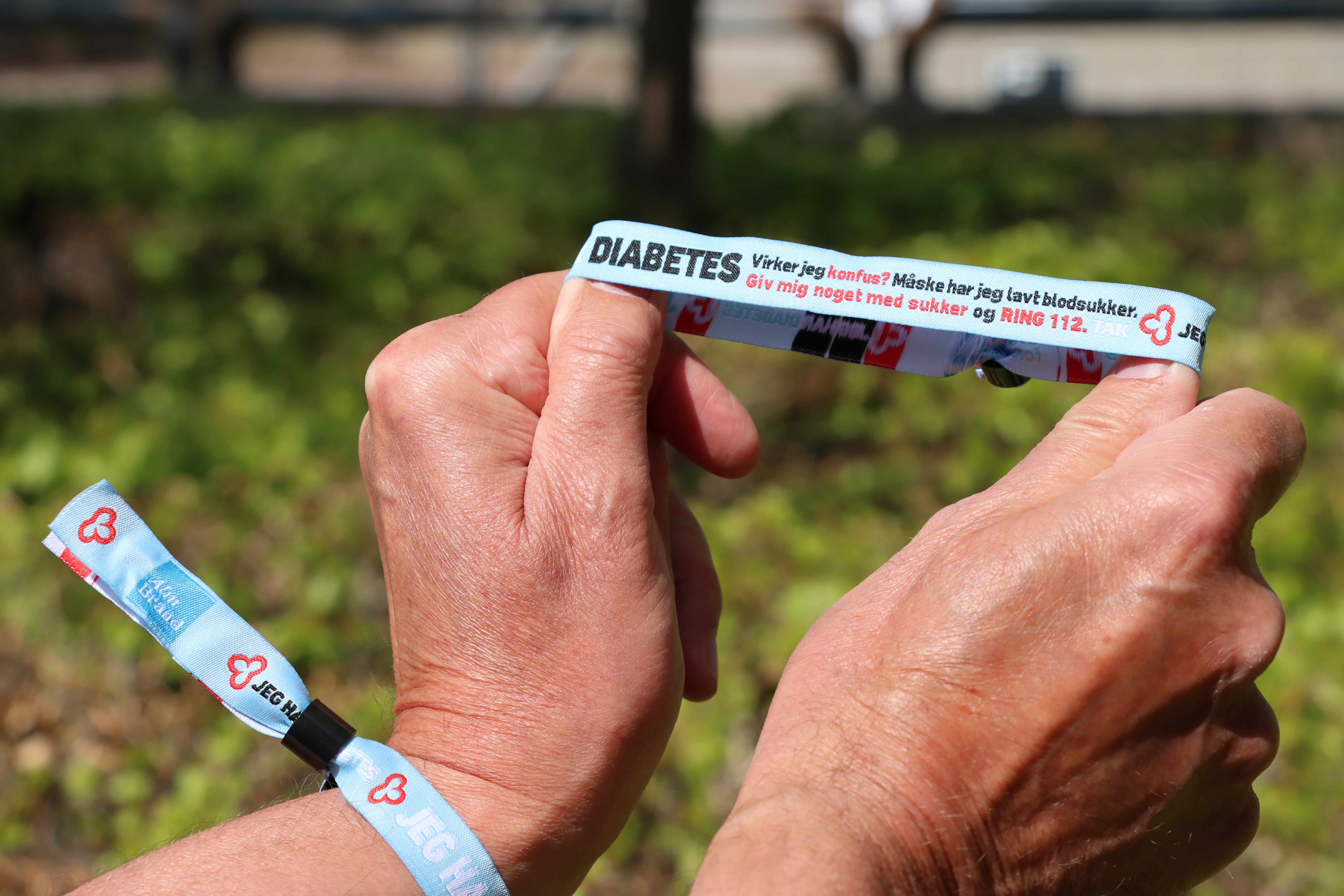 ”JEG HAR DIABETES. Virker jeg konfus? Måske har jeg lavt blodsukker. Giv mig noget med sukker og RING 112. TAK”, står der på det lyseblå diabetes-armbånd.